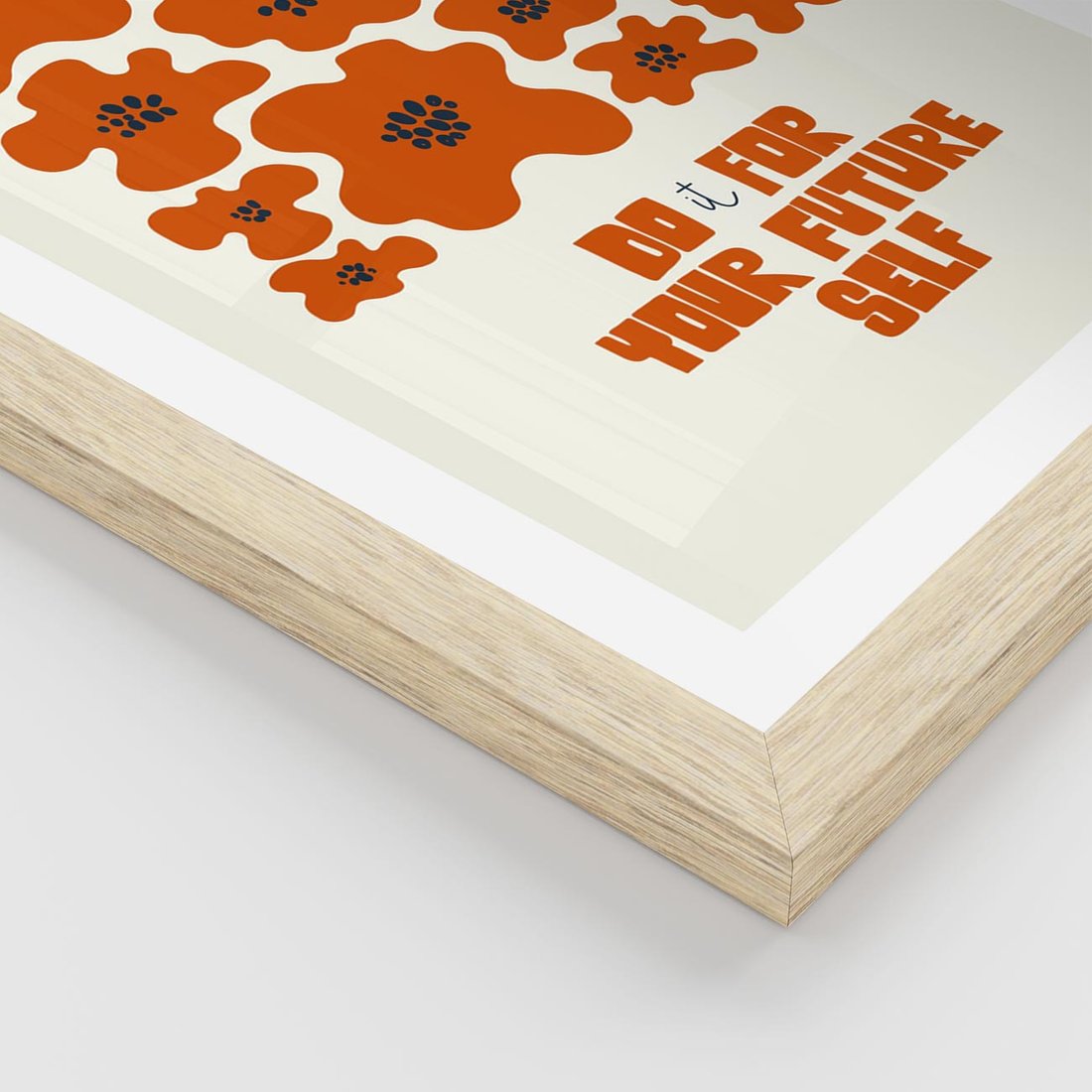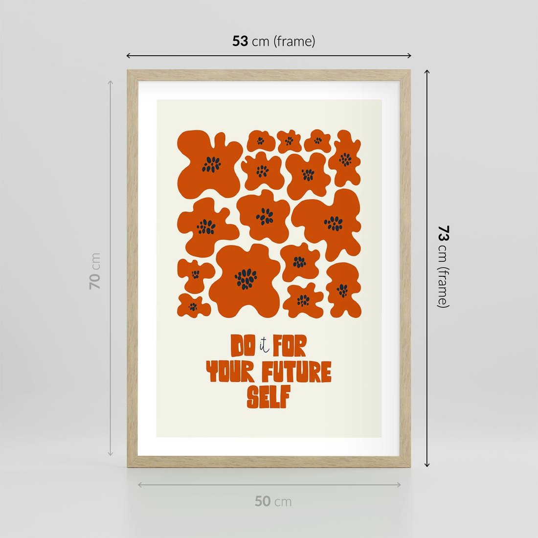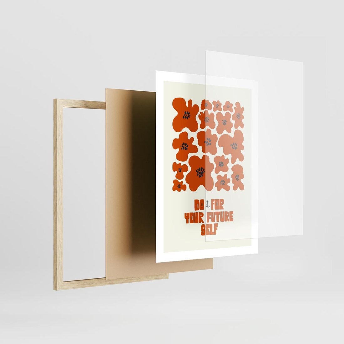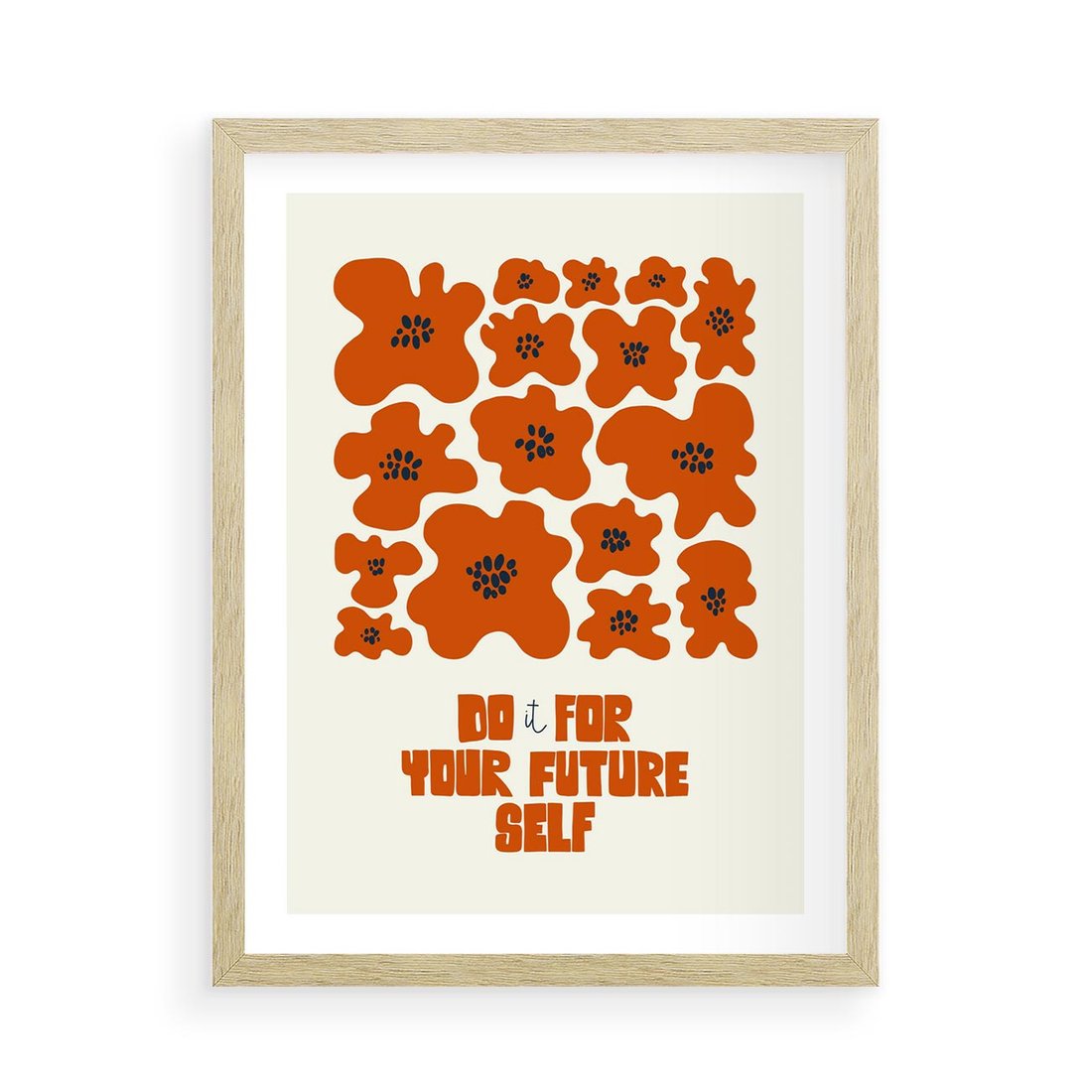 Ta nowoczesna grafika przedstawia kompozycję pomarańczowych kwiatów, która odzwierciedla ideę self-care. To obraz, który przypomina o ważności dbania o siebie, zachęcając do wewnętrznego odprężenia. Połączenie kwiatów z inspirującą typografią tworzy piękny przekaz, wprowadzając do wnętrza dawkę pozytywnej energii.
