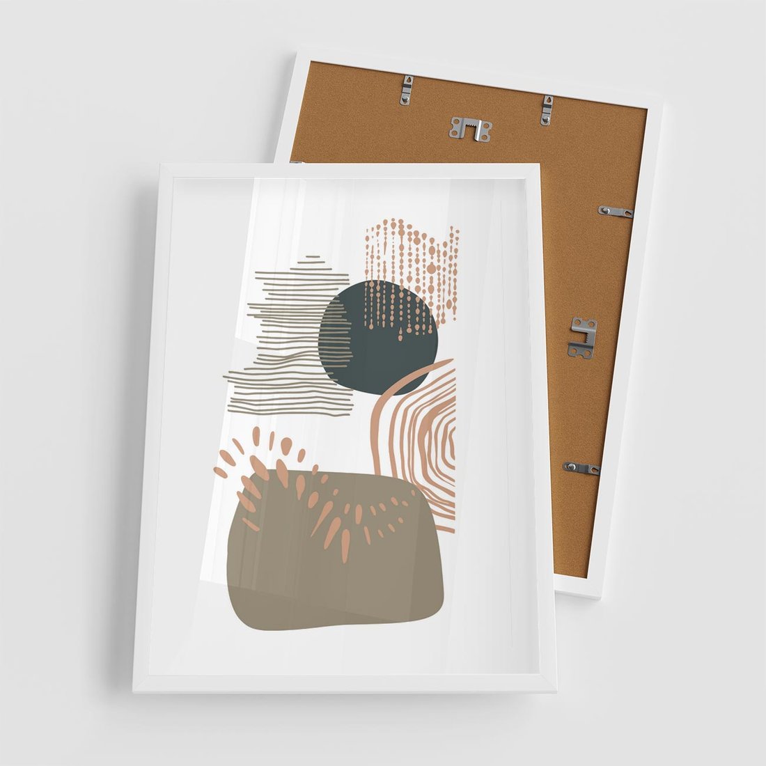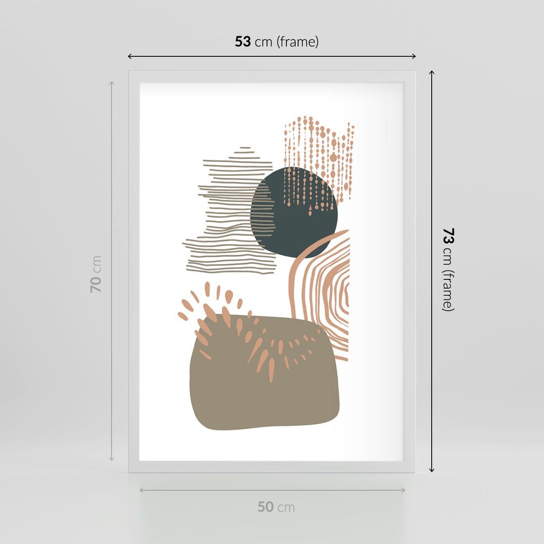 Plakat w ramie 50x70 - Taniec Plam - abstrakcyjna kompozycja z kropek kresek i kółek, odcienie brązu i beżu - rama biała