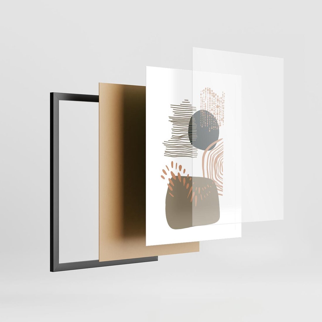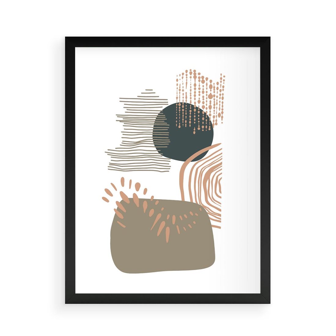 Plakat w ramie 50x70 - Taniec Plam - abstrakcyjna kompozycja z kropek kresek i kółek, odcienie brązu i beżu - rama czarna