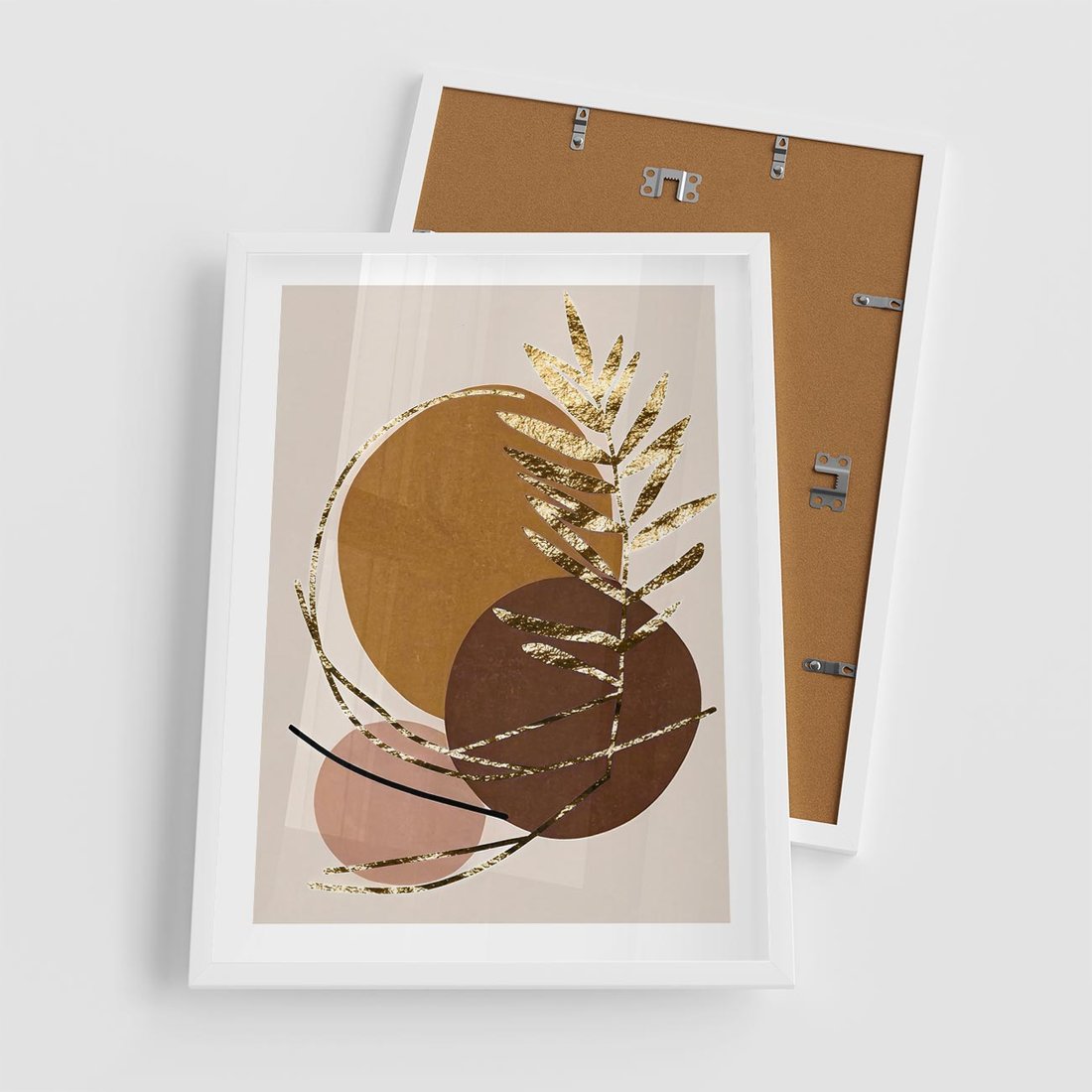 Ten abstrakcyjny obraz to prawdziwe dzieło sztuki, gdzie złote liście palmy kontrastują z geometrycznymi formami w odcieniach brązu. Kompozycja ta tworzy niepowtarzalny efekt, dodając elegancji i nowoczesności wnętrzu. To idealny sposób na dodanie wyjątkowego akcentu do Twojej przestrzeni.