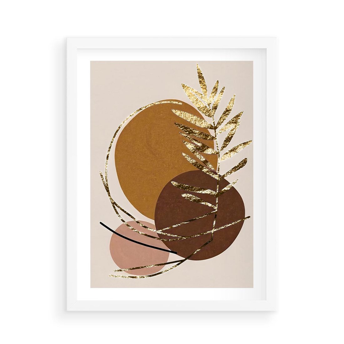 Plakat w ramie 50x70 - Taniec Przenikających Odbić - abstrakcyjny obraz, złote liście palmy - rama biała