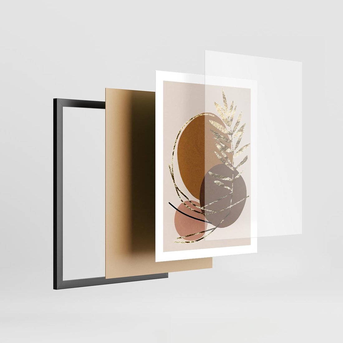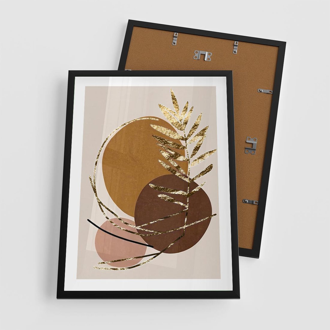 Ten abstrakcyjny obraz to prawdziwe dzieło sztuki, gdzie złote liście palmy kontrastują z geometrycznymi formami w odcieniach brązu. Kompozycja ta tworzy niepowtarzalny efekt, dodając elegancji i nowoczesności wnętrzu. To idealny sposób na dodanie wyjątkowego akcentu do Twojej przestrzeni.