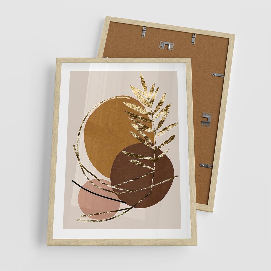 Ten abstrakcyjny obraz to prawdziwe dzieło sztuki, gdzie złote liście palmy kontrastują z geometrycznymi formami w odcieniach brązu. Kompozycja ta tworzy niepowtarzalny efekt, dodając elegancji i nowoczesności wnętrzu. To idealny sposób na dodanie wyjątkowego akcentu do Twojej przestrzeni.