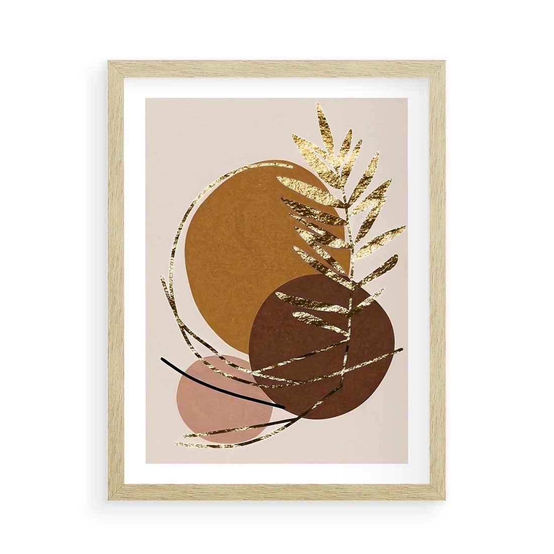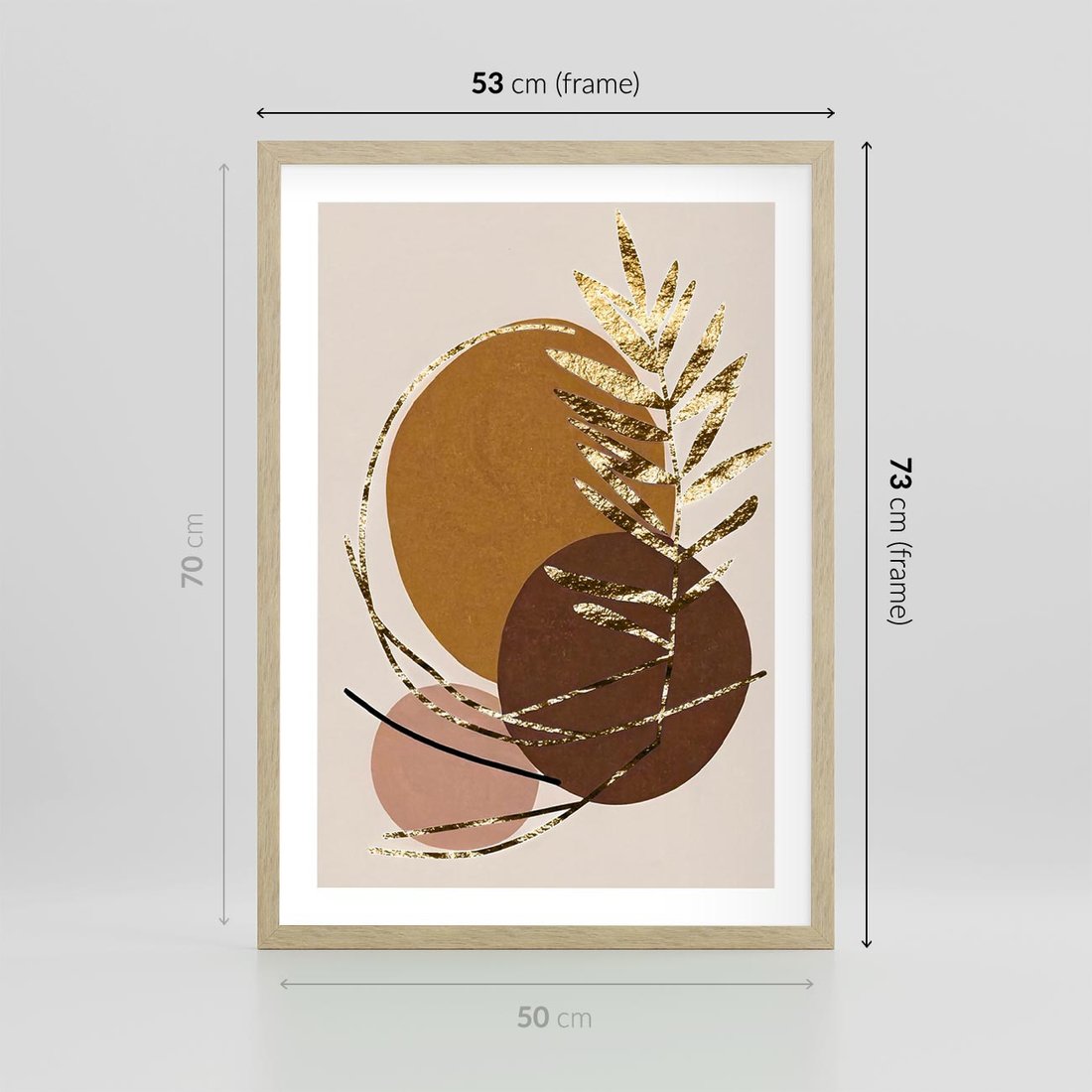 Plakat w ramie 50x70 - Taniec Przenikających Odbić - abstrakcyjny obraz, złote liście palmy - rama drewno