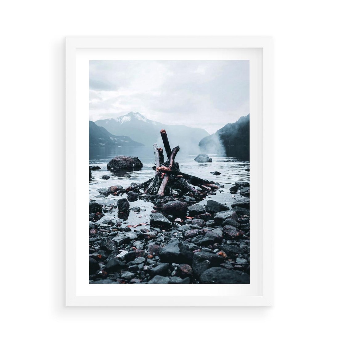 Plakat w ramie 50x70 - To ujęcie jeziora w górach z zgaszonym ogniskiem nad brzegiem, tworząc atmosferę spokoju i refleksji w otoczeniu przyrody. - jezioro w górach, zgaszone ognisko - rama biała