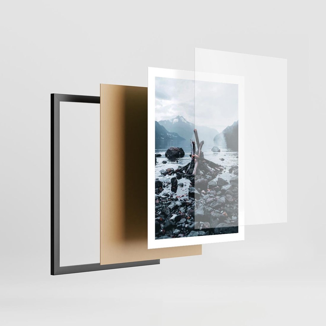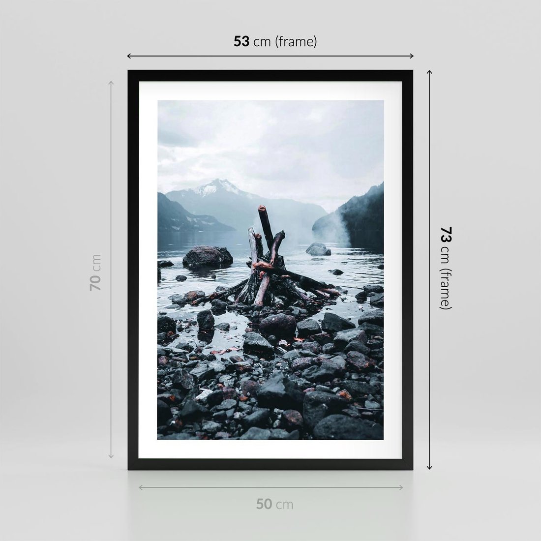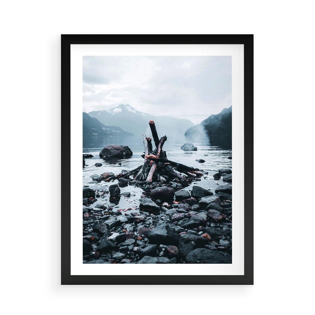 Plakat w ramie 50x70 - To ujęcie jeziora w górach z zgaszonym ogniskiem nad brzegiem, tworząc atmosferę spokoju i refleksji w otoczeniu przyrody. - jezioro w górach, zgaszone ognisko - rama czarna