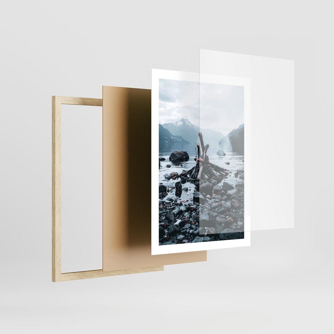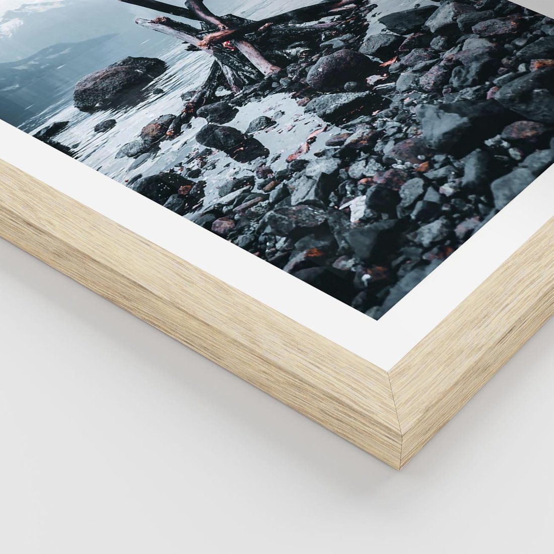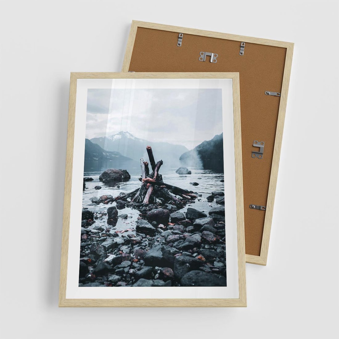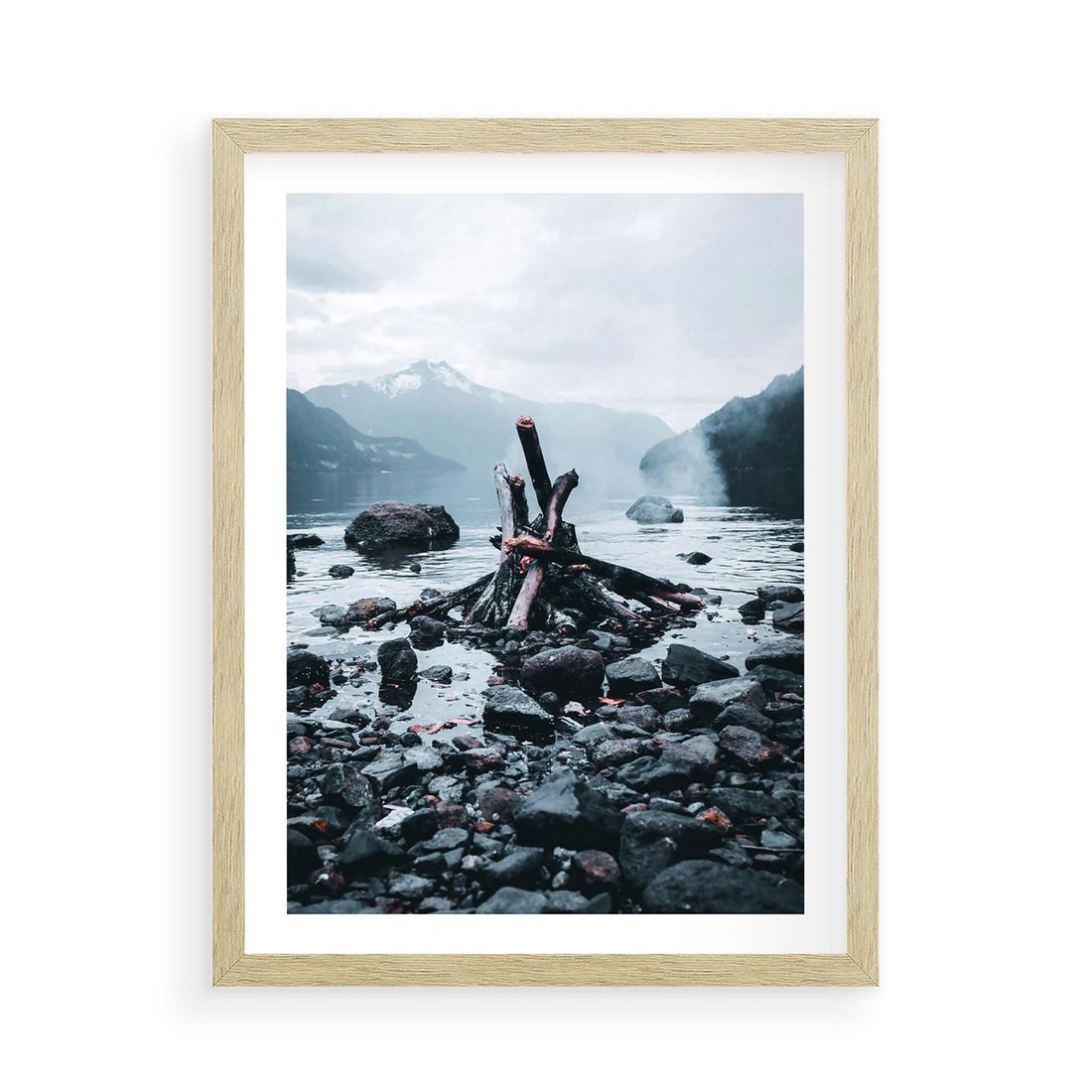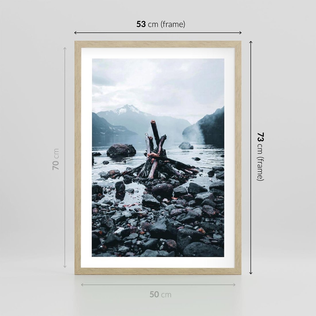 Plakat w ramie 50x70 - To ujęcie jeziora w górach z zgaszonym ogniskiem nad brzegiem, tworząc atmosferę spokoju i refleksji w otoczeniu przyrody. - jezioro w górach, zgaszone ognisko - rama drewno