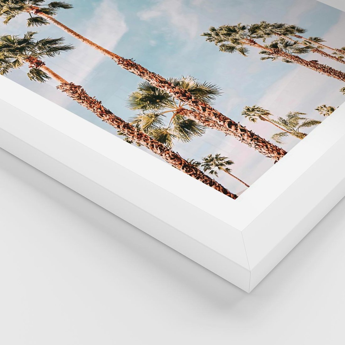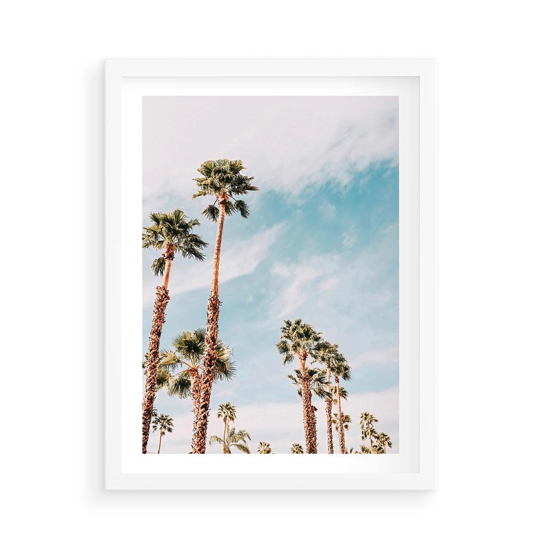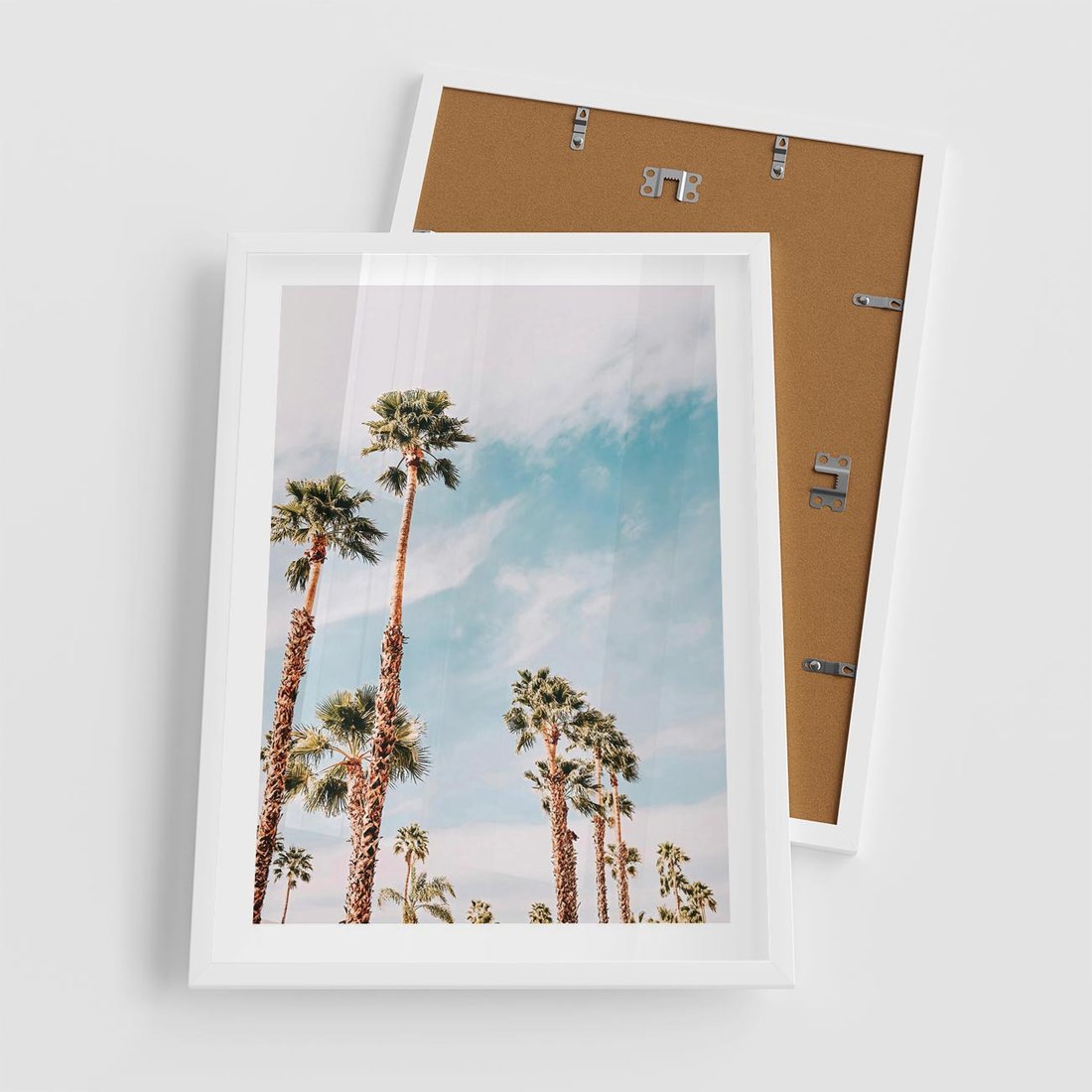 Plakat w ramie 50x70 - Tropikalna Sielskość: Palmy i Błękitne Niebo - palmy na tle błękitnego nieba - rama biała