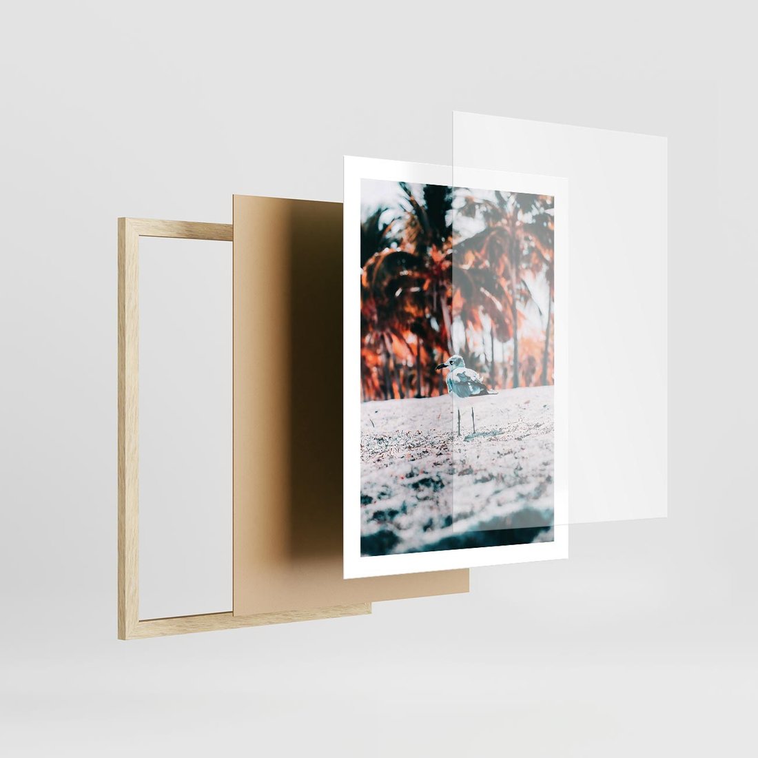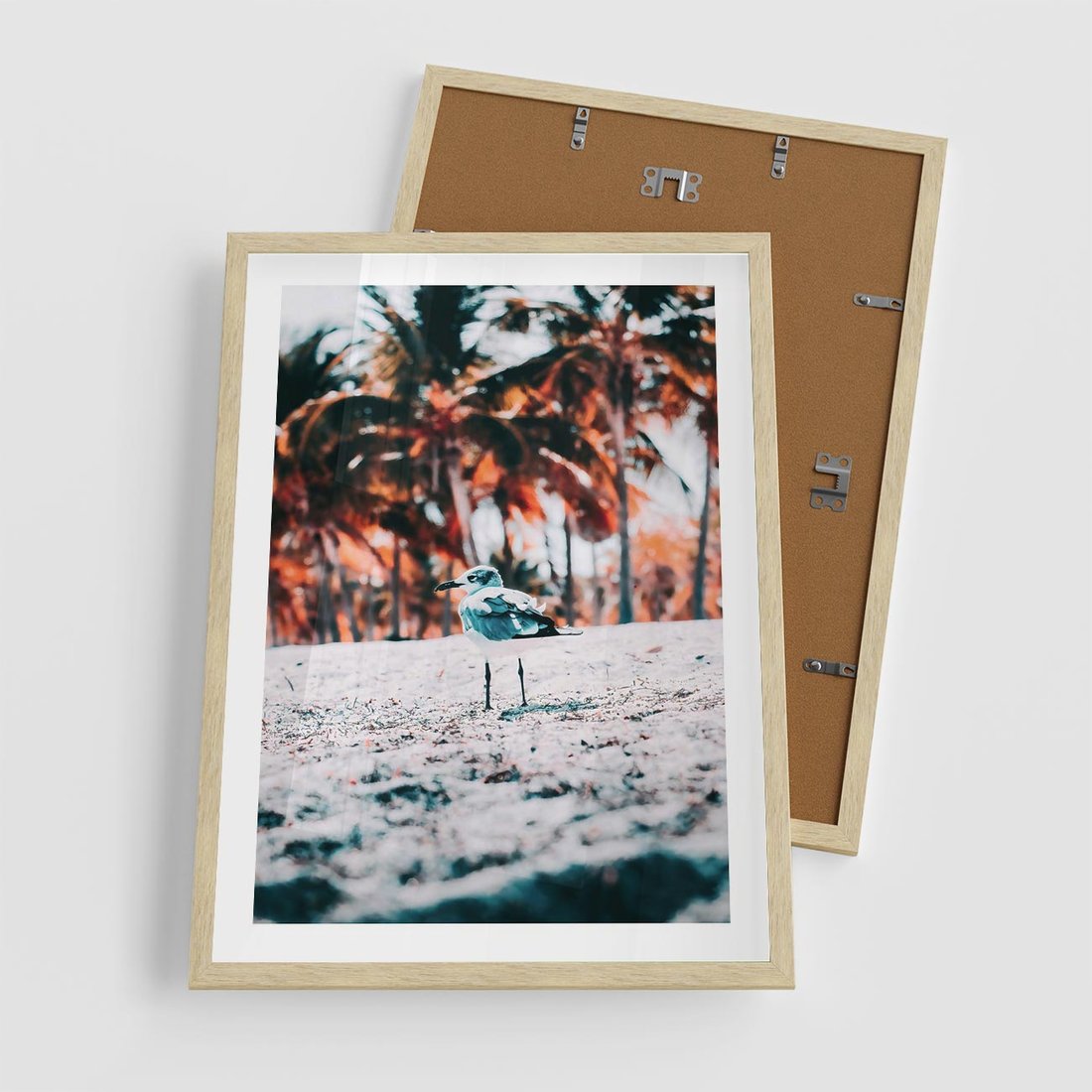 Plakat w ramie 50x70 - Tropikalna Uroda: Plaża z Mewą - tropikalna plaża, mewa na piasku - rama drewno