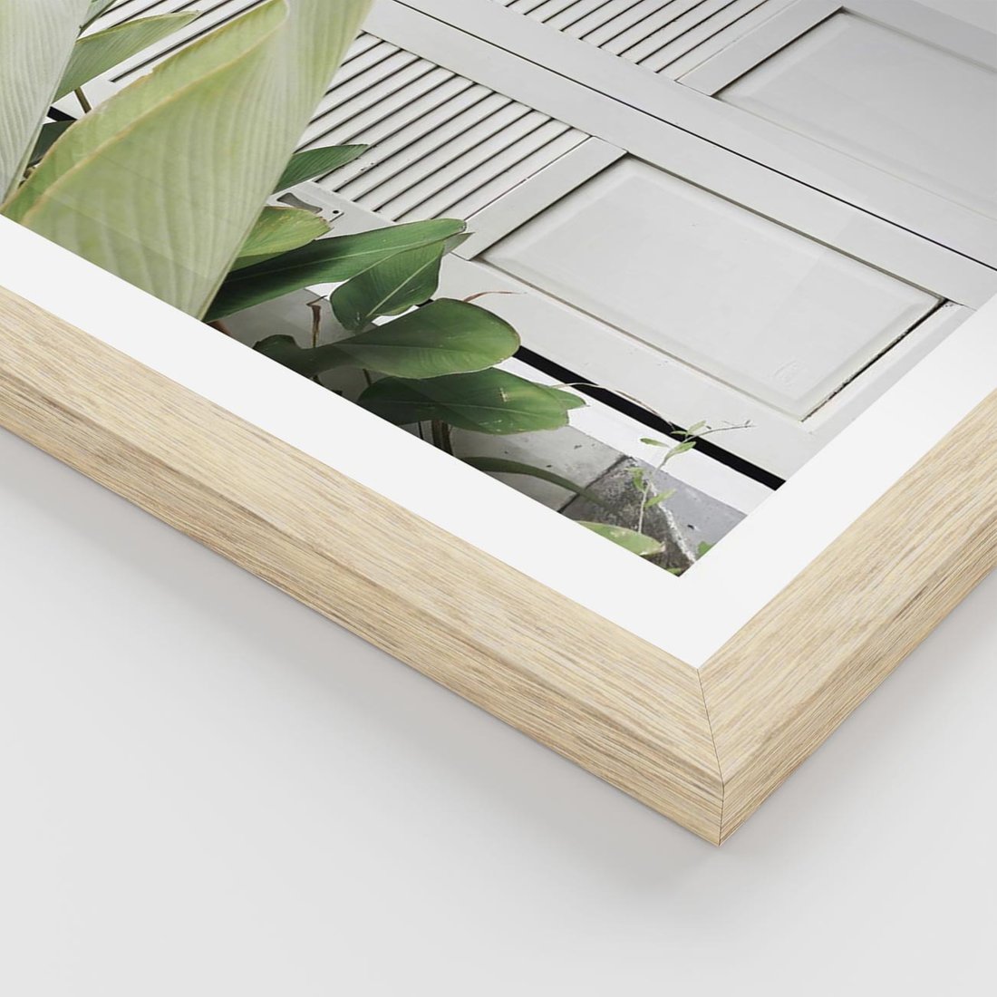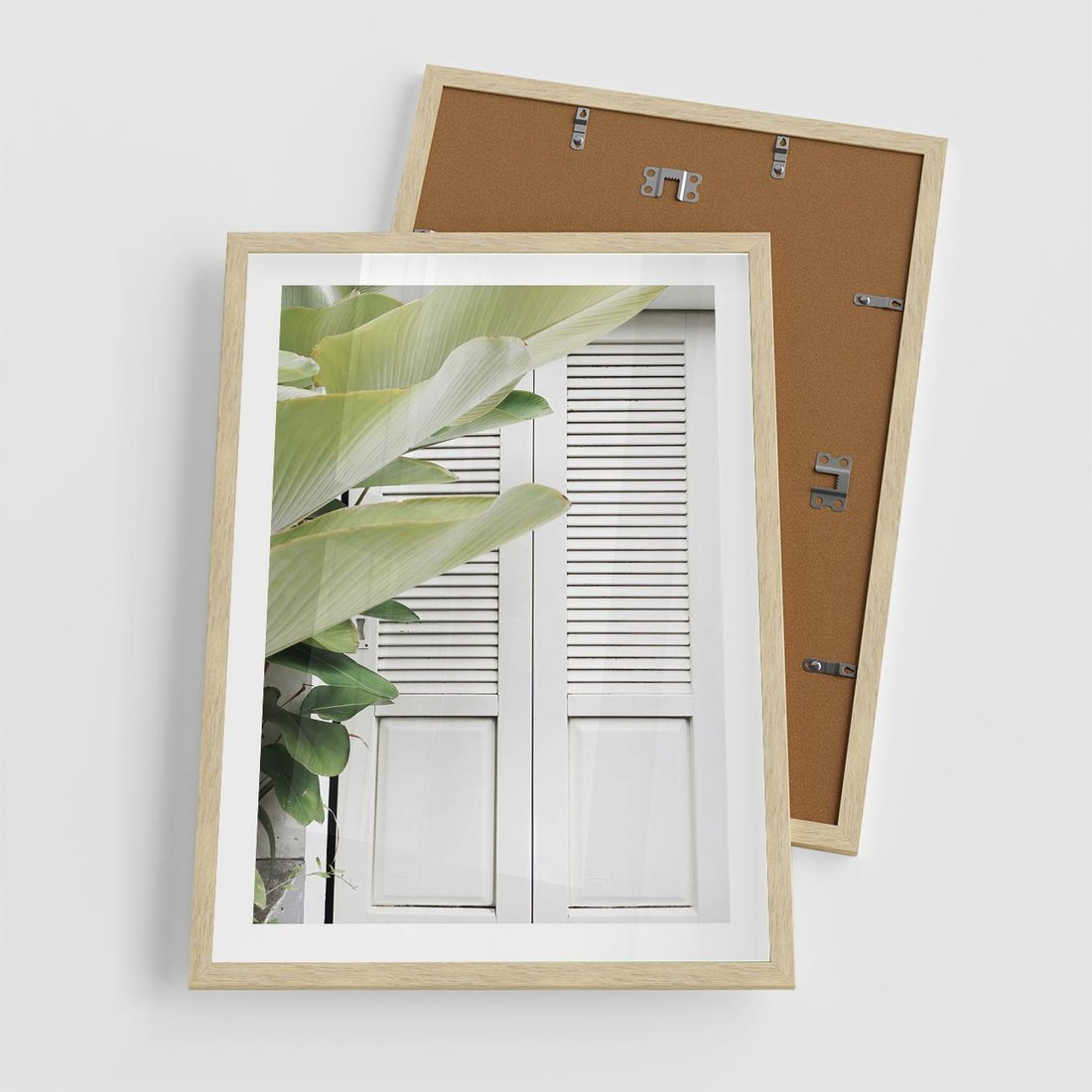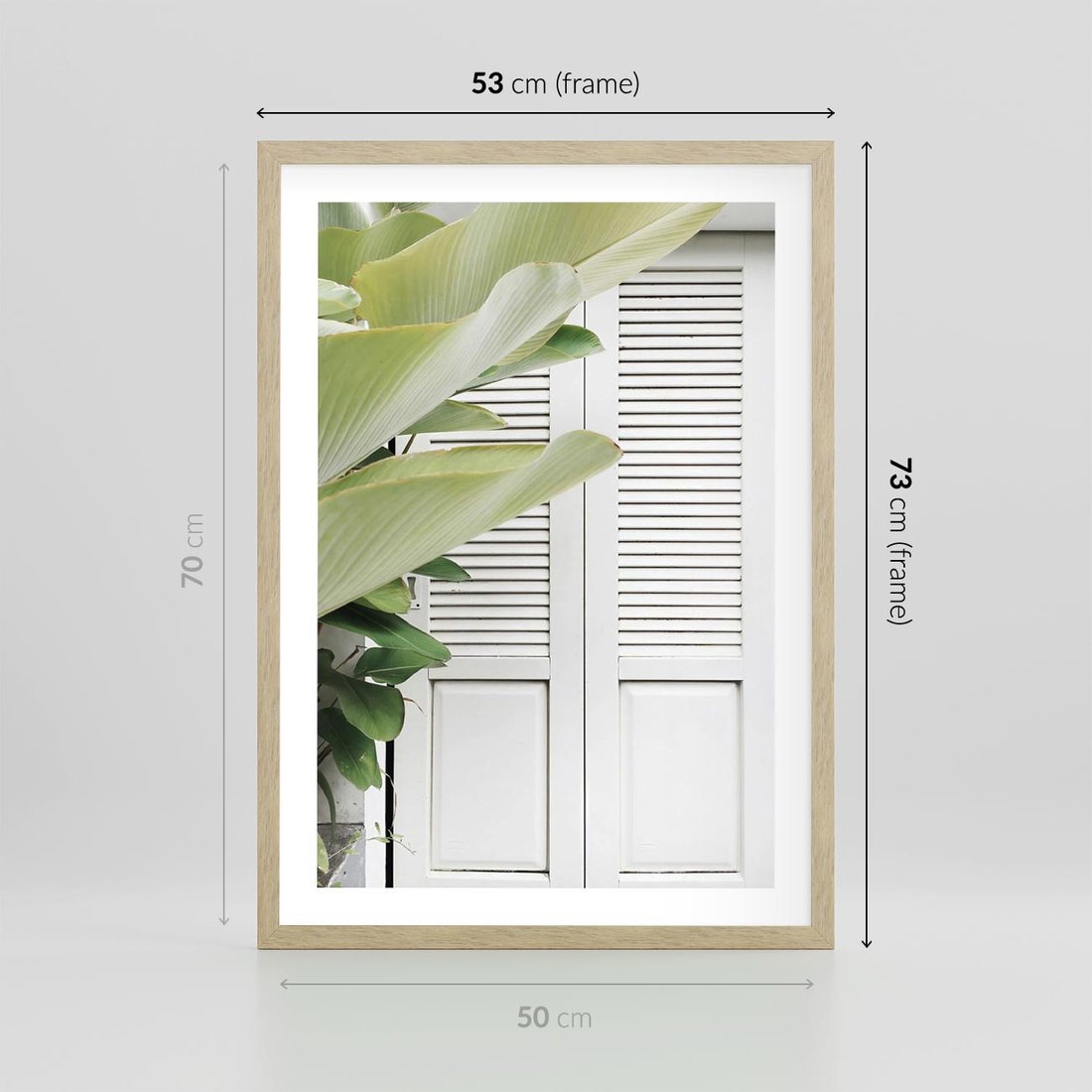Plakat w ramie 50x70 - Tropikalne Okno - białe okiennice, zielona tropikalna roślina - rama drewno