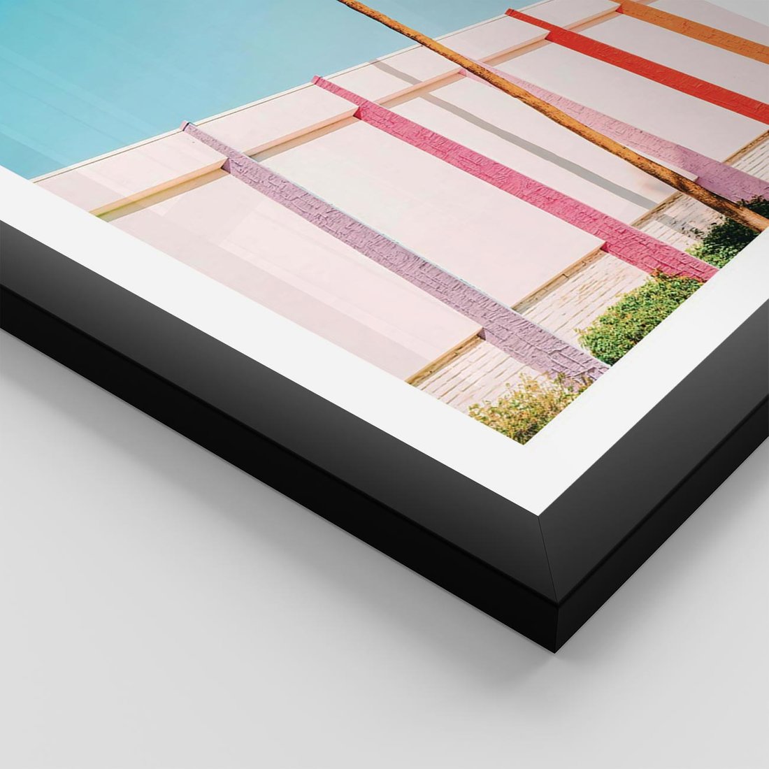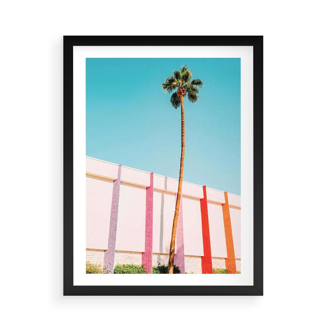 Obraz przedstawia palmę na tle błękitnego nieba oraz kolorowy mur o odcieniach pasteli. To harmonijne połączenie natury i architektury, które nadaje obrazowi radosny i tropikalny charakter.