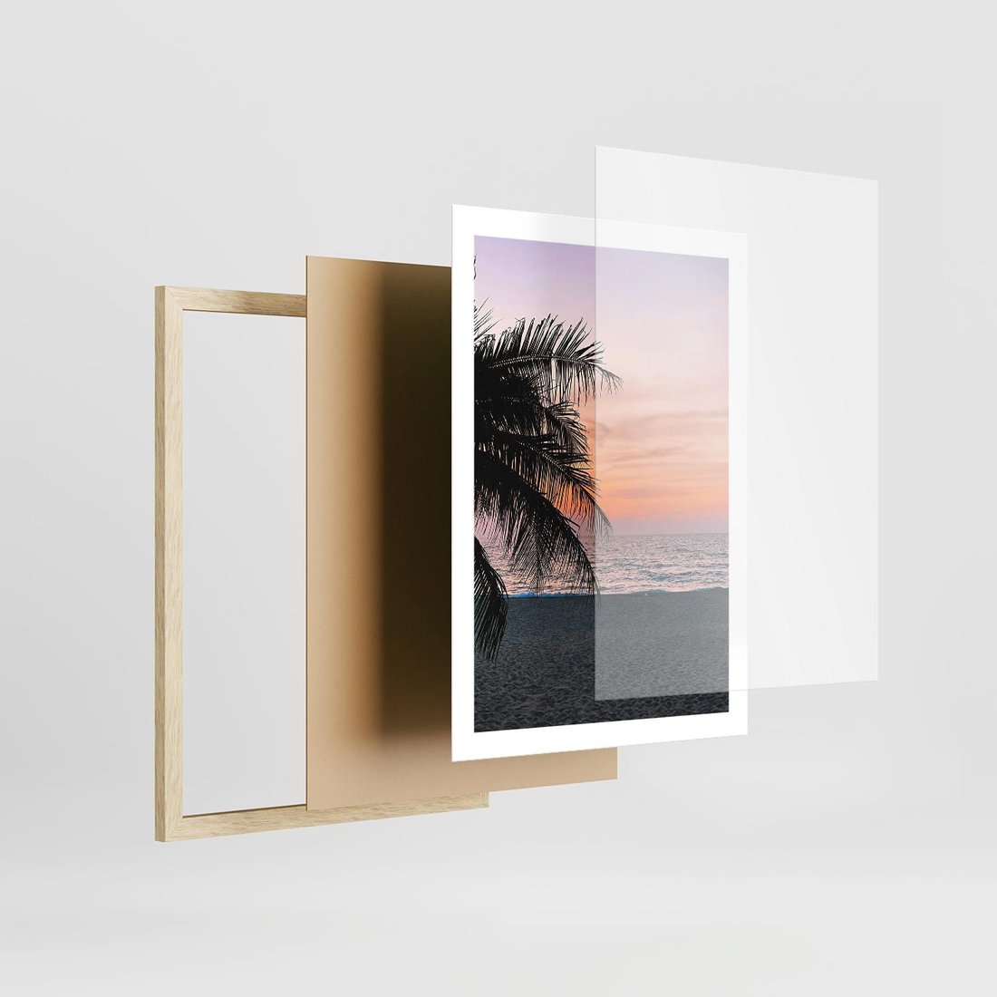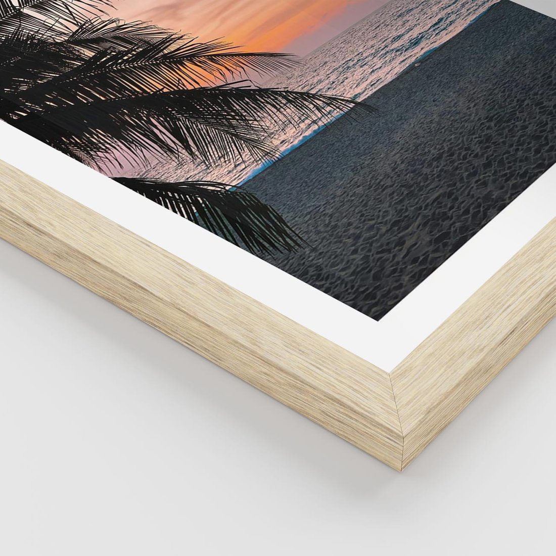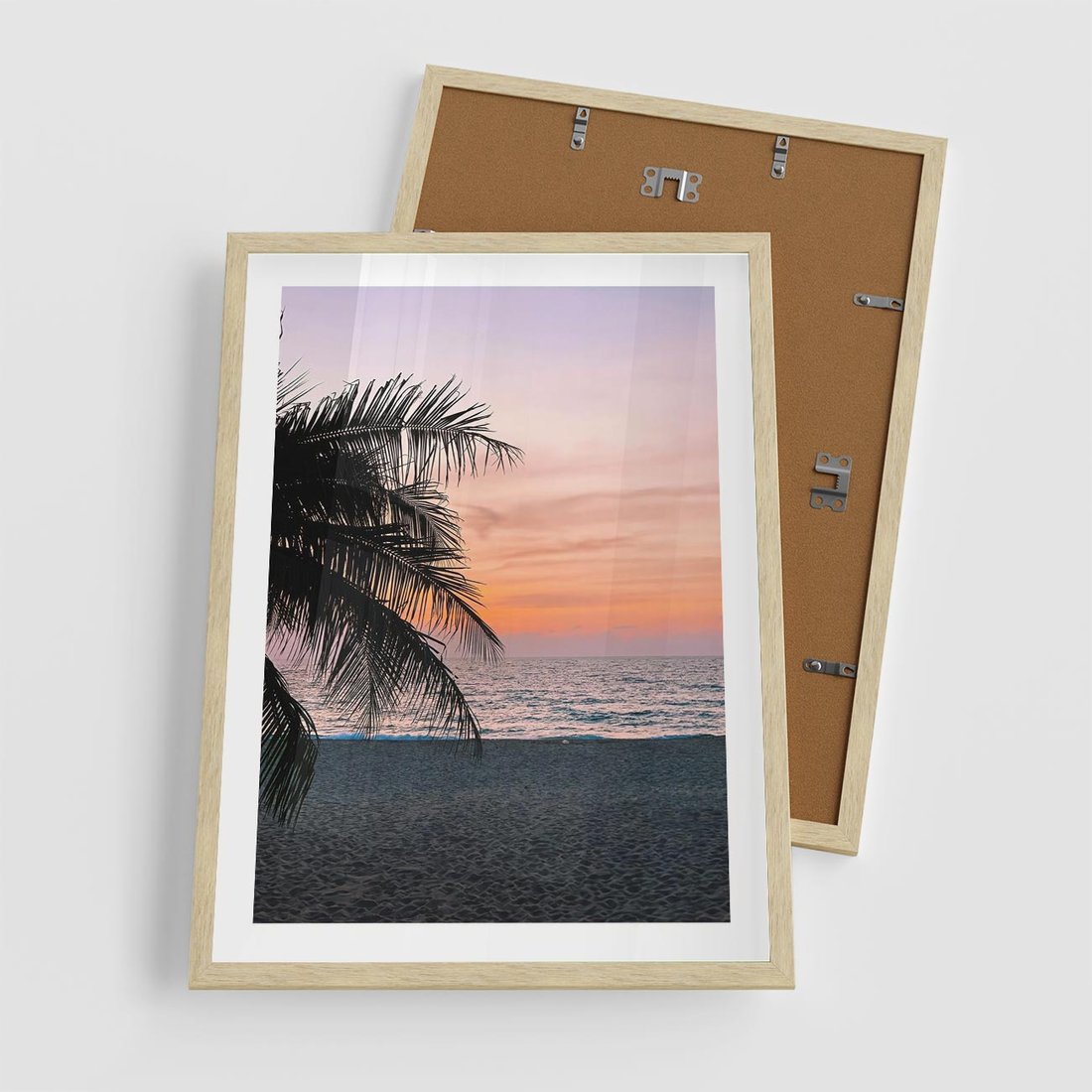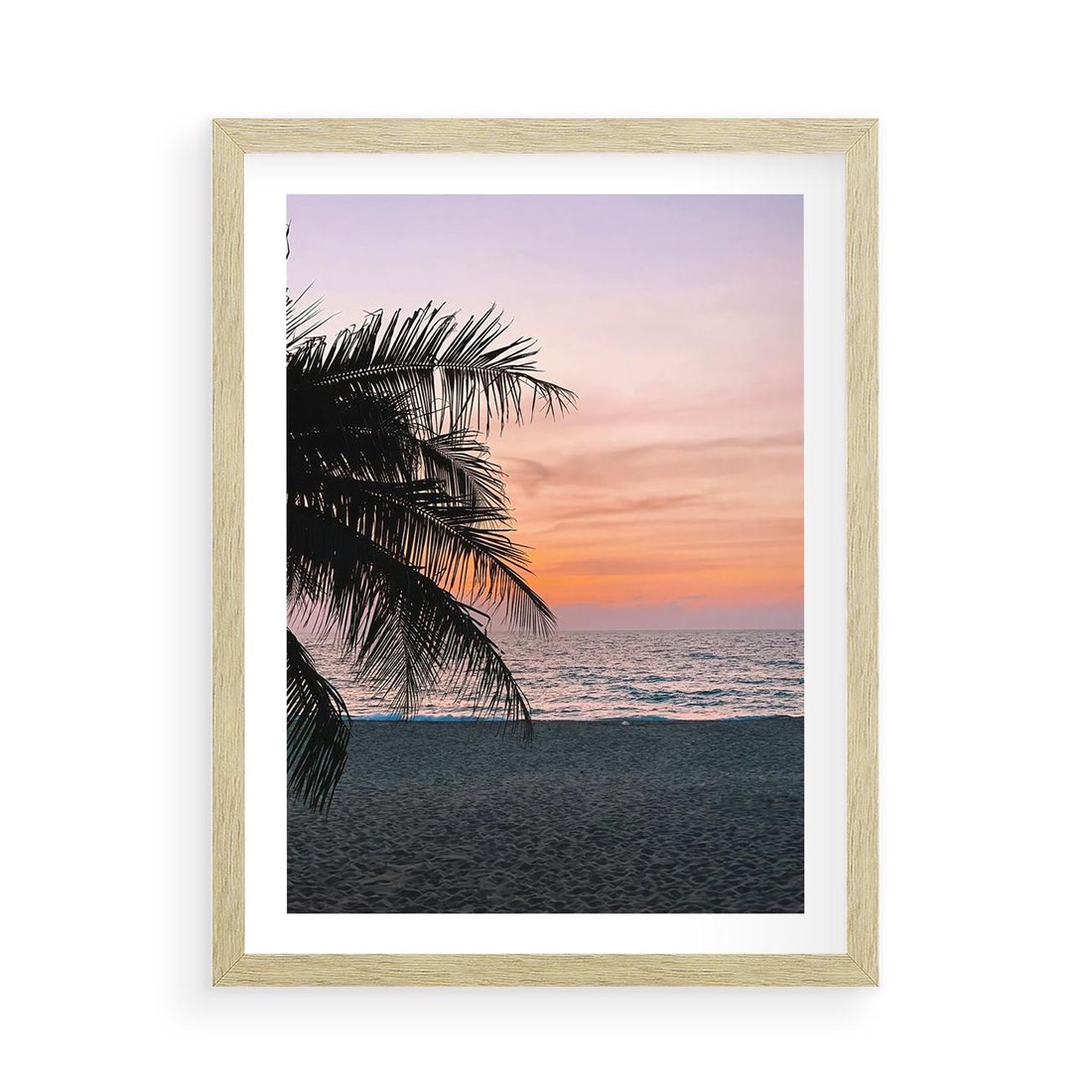 Plakat w ramie 50x70 - Tropikalny Zachód Słońca: Piękno Palmy - palma, nad morzem - rama drewno