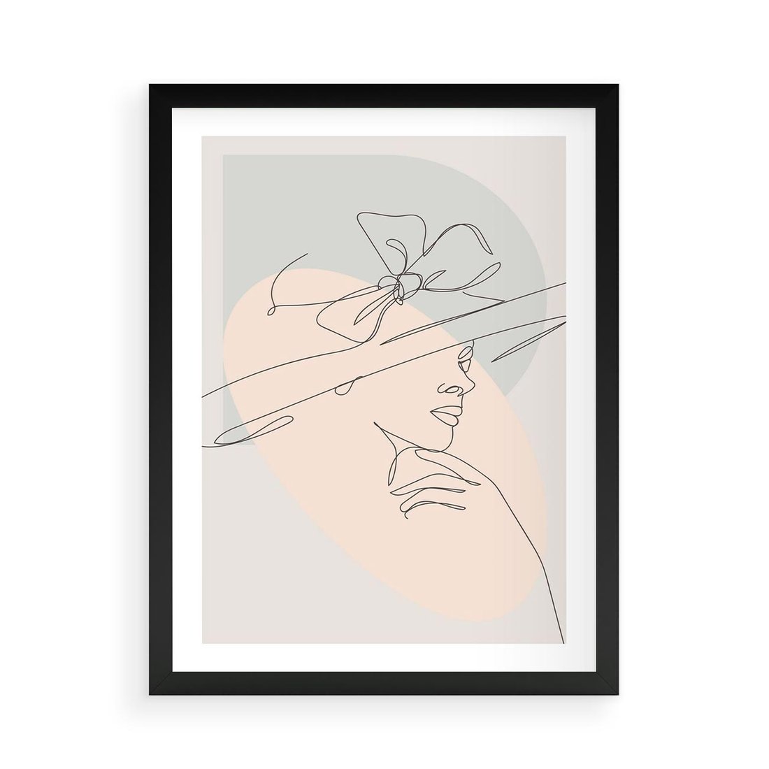 Obraz przedstawia minimalistyczną grafikę w pastelowych tonach, która jest szkicem twarzy kobiety narysowanym jedną linią. Ta kompozycja jest subtelna i wyrazista.