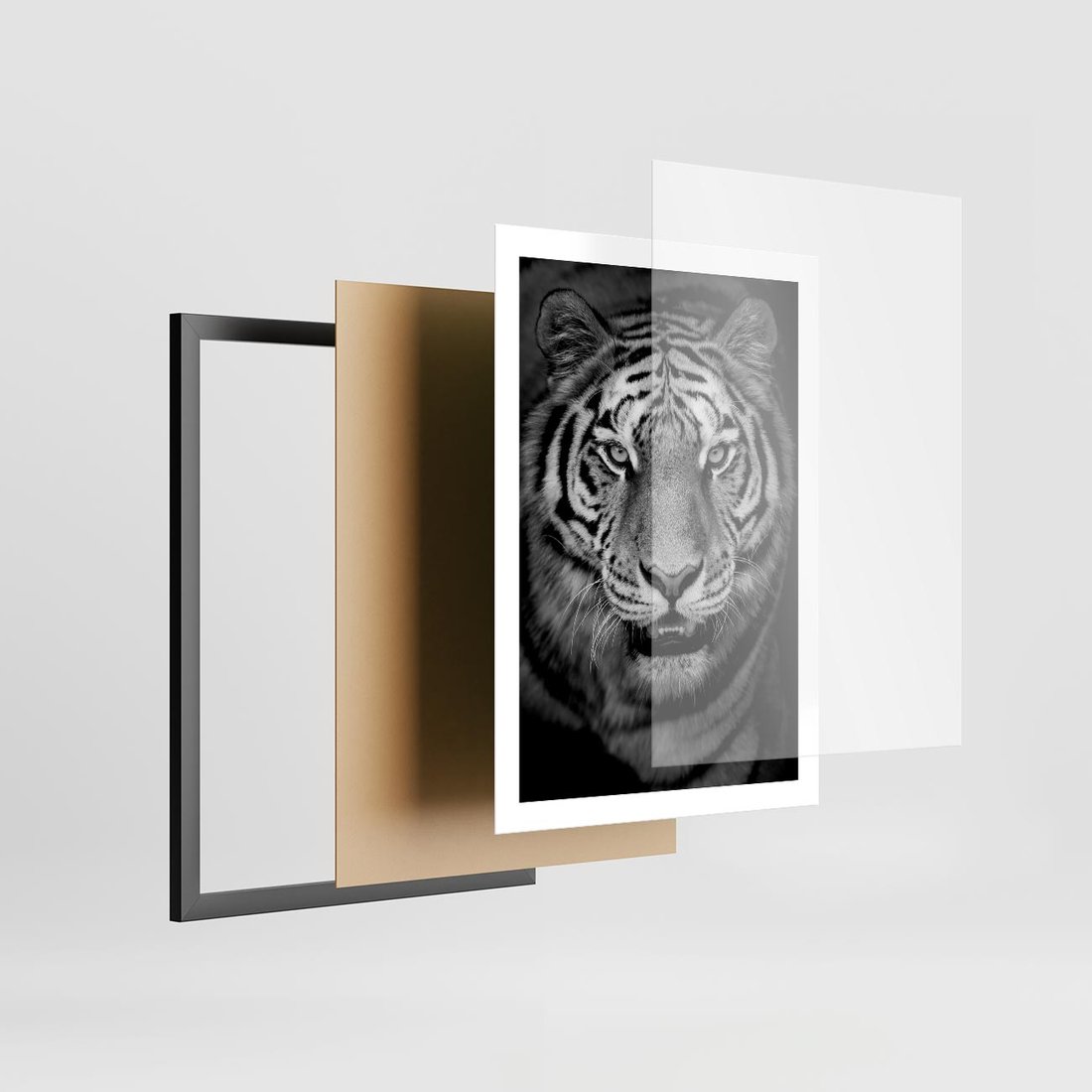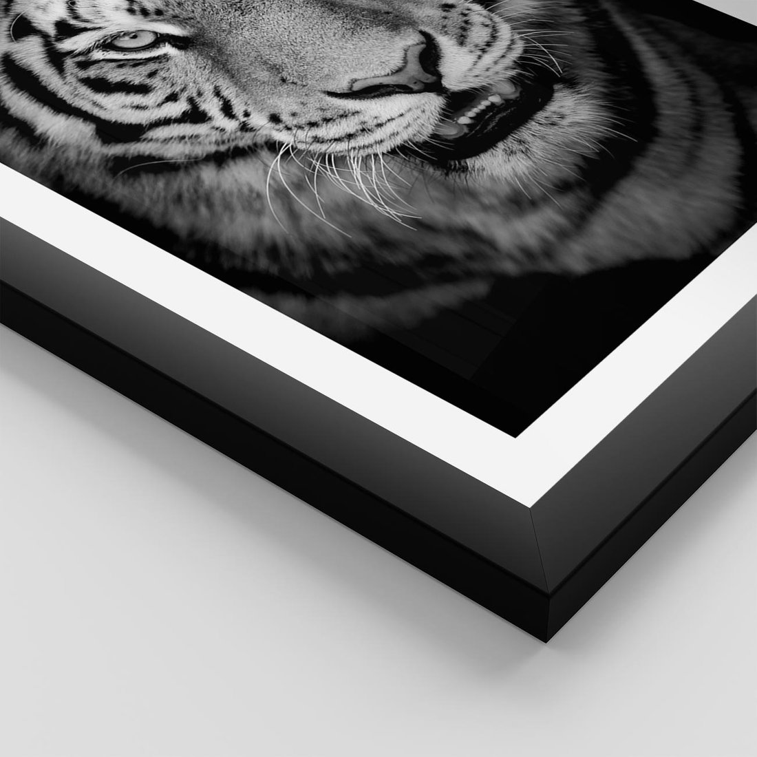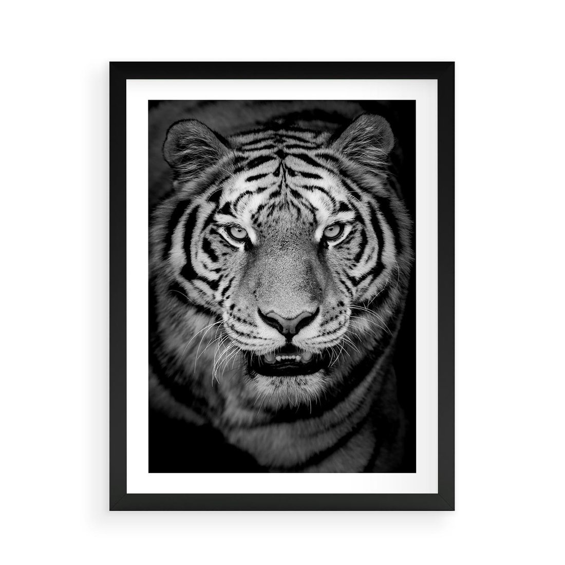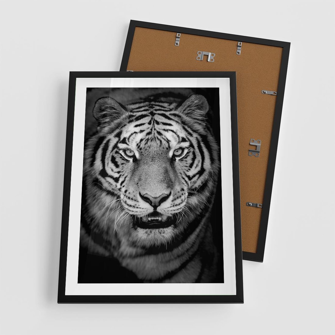 Plakat w ramie 50x70 - Tygrys Czarno-Biały: Siła i Delikatność - tygrys, czarno - rama czarna