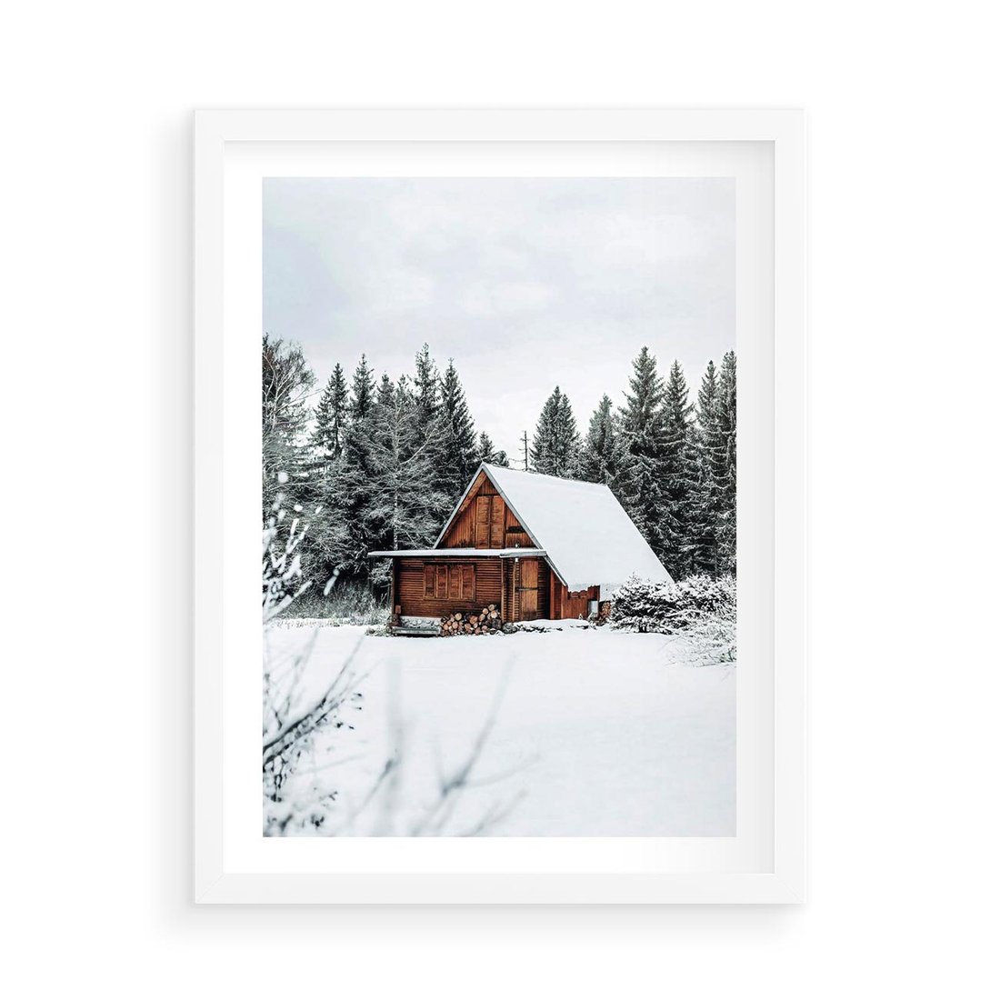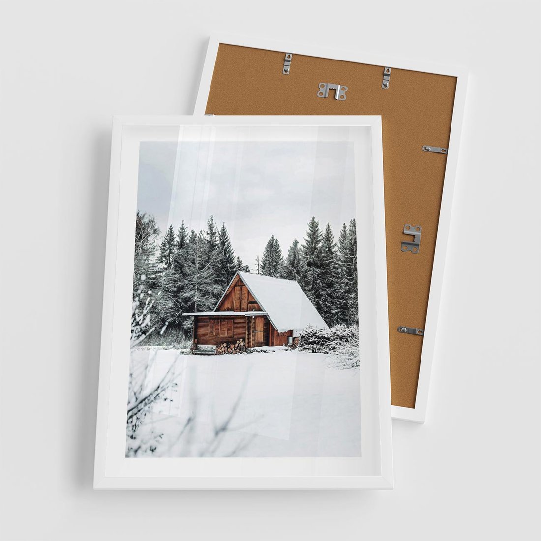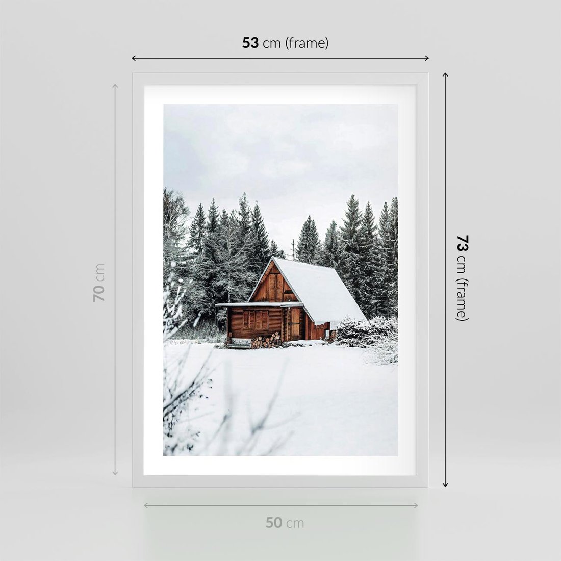 Plakat w ramie 50x70 - Ujęcie zimy w Górach - domek w górach w zimie, śnieg - rama biała