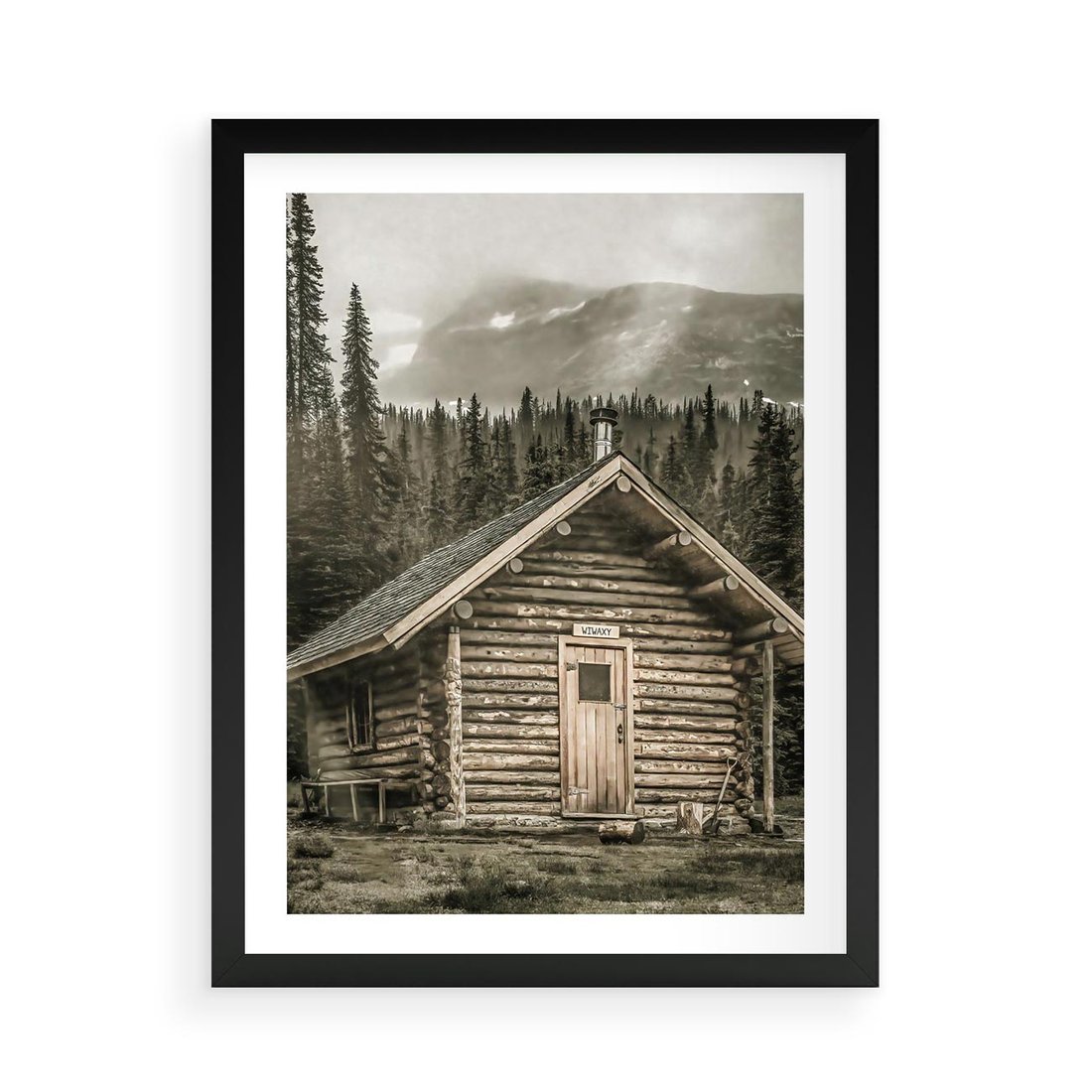 Plakat w ramie 50x70 - Urok Drewnianej Chatki w Górach - chatka w górach, drewniany domek - rama czarna