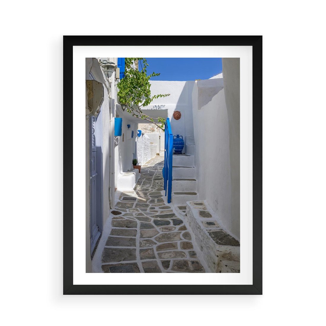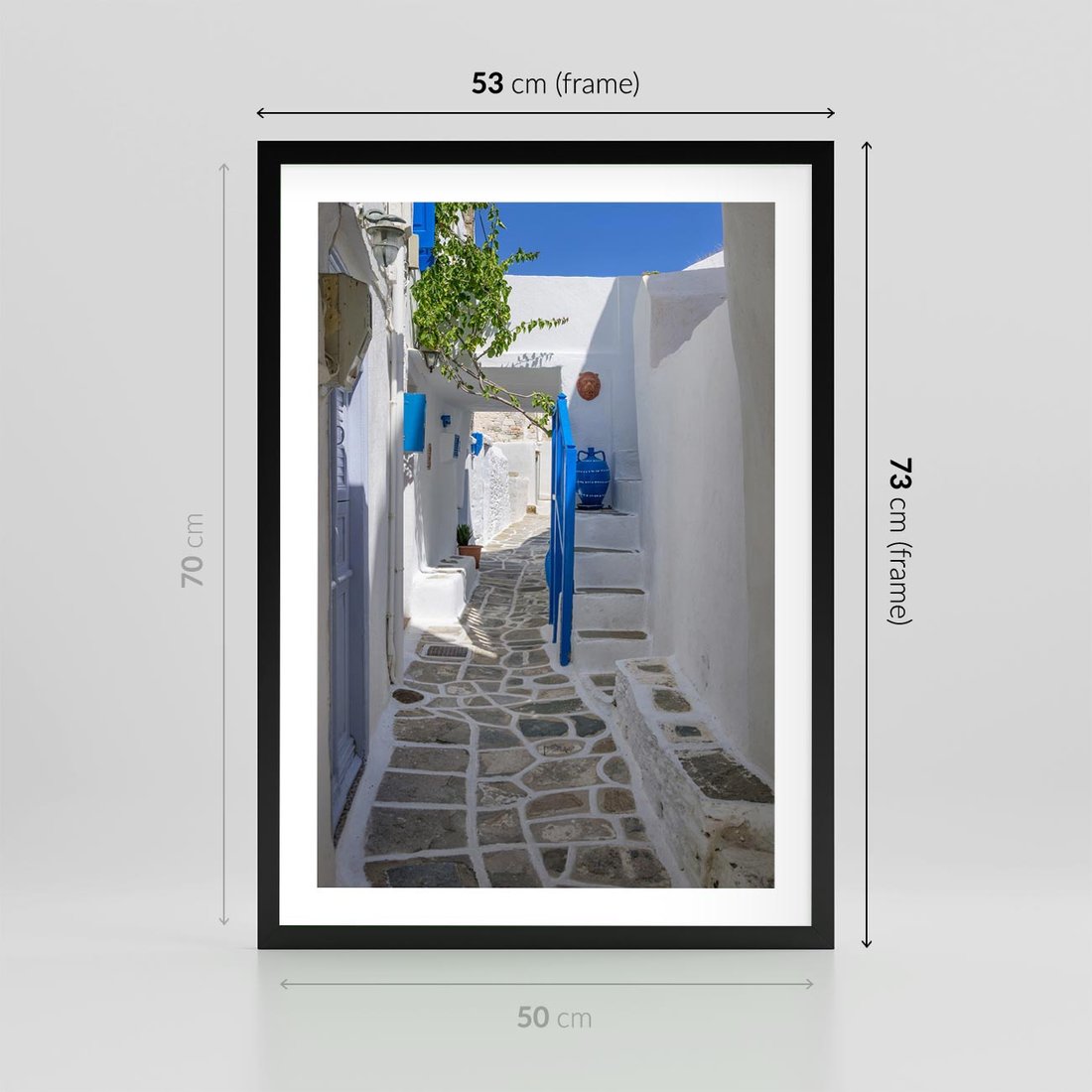 Plakat w ramie 50x70 - Uroki Santorini: Perspektywiczna Uliczka - uliczka, perspektywa - rama czarna