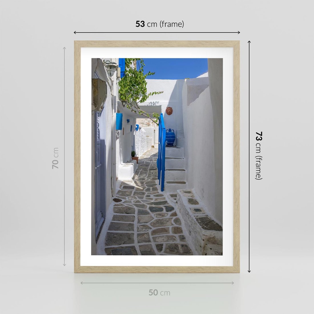 Plakat w ramie 50x70 - Uroki Santorini: Perspektywiczna Uliczka - uliczka, perspektywa - rama drewno