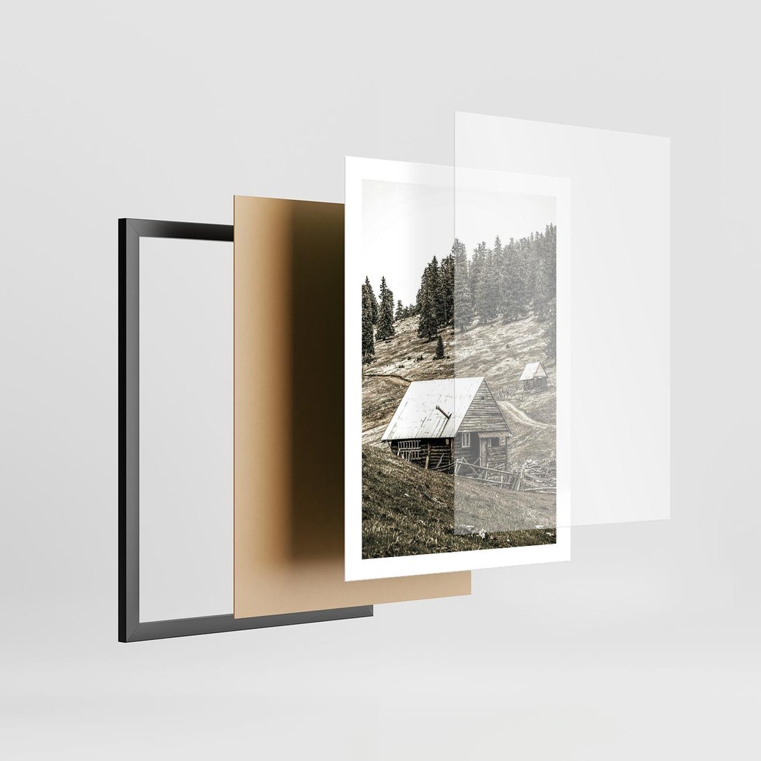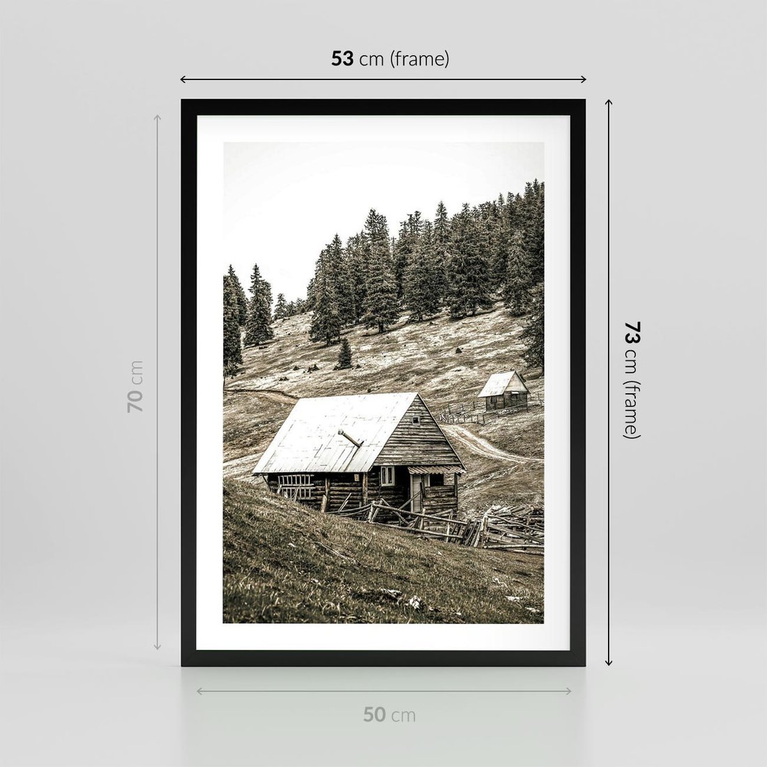 Plakat w ramie 50x70 - Ustronne Chatki w Górach - rustykalne domki w górach, sepia - rama czarna