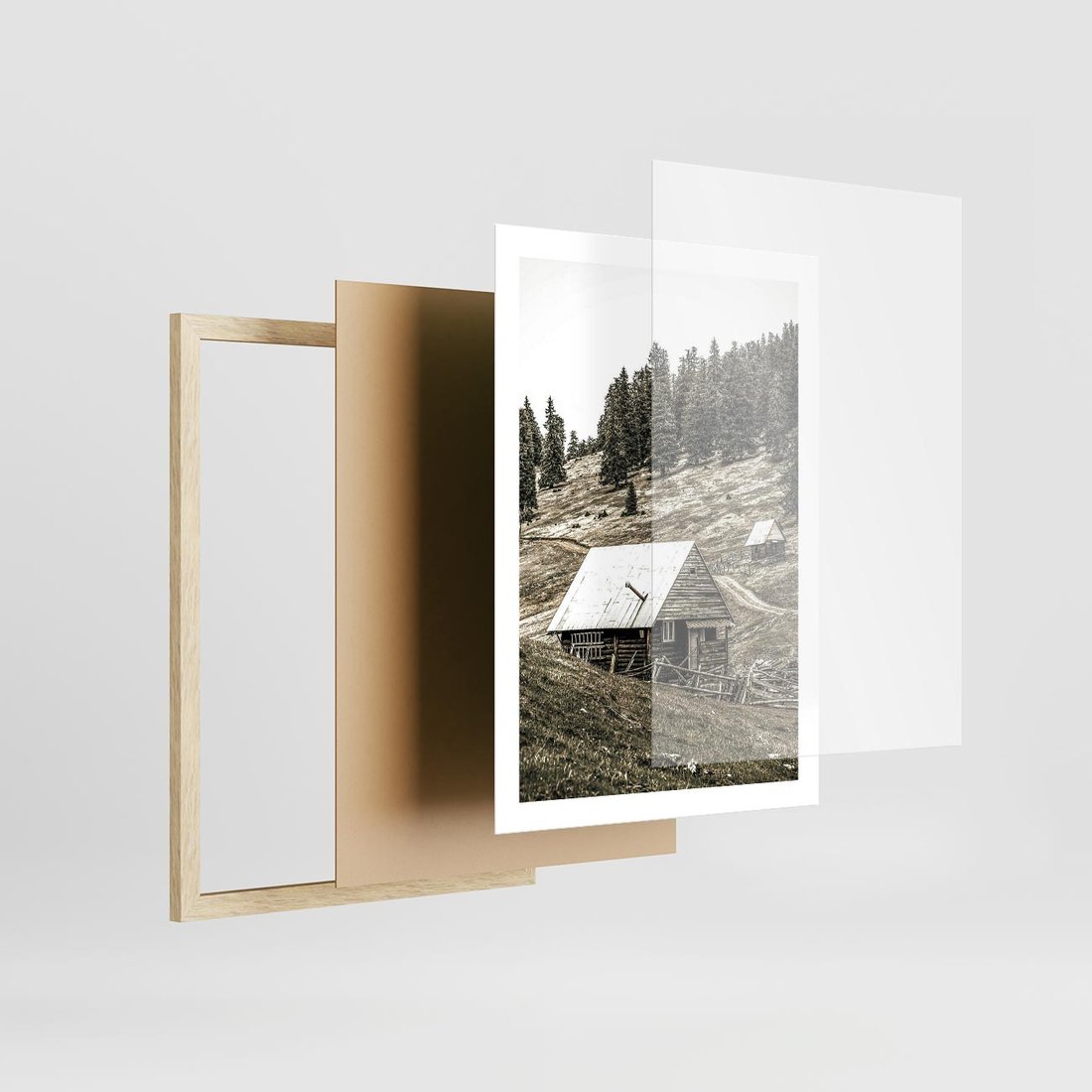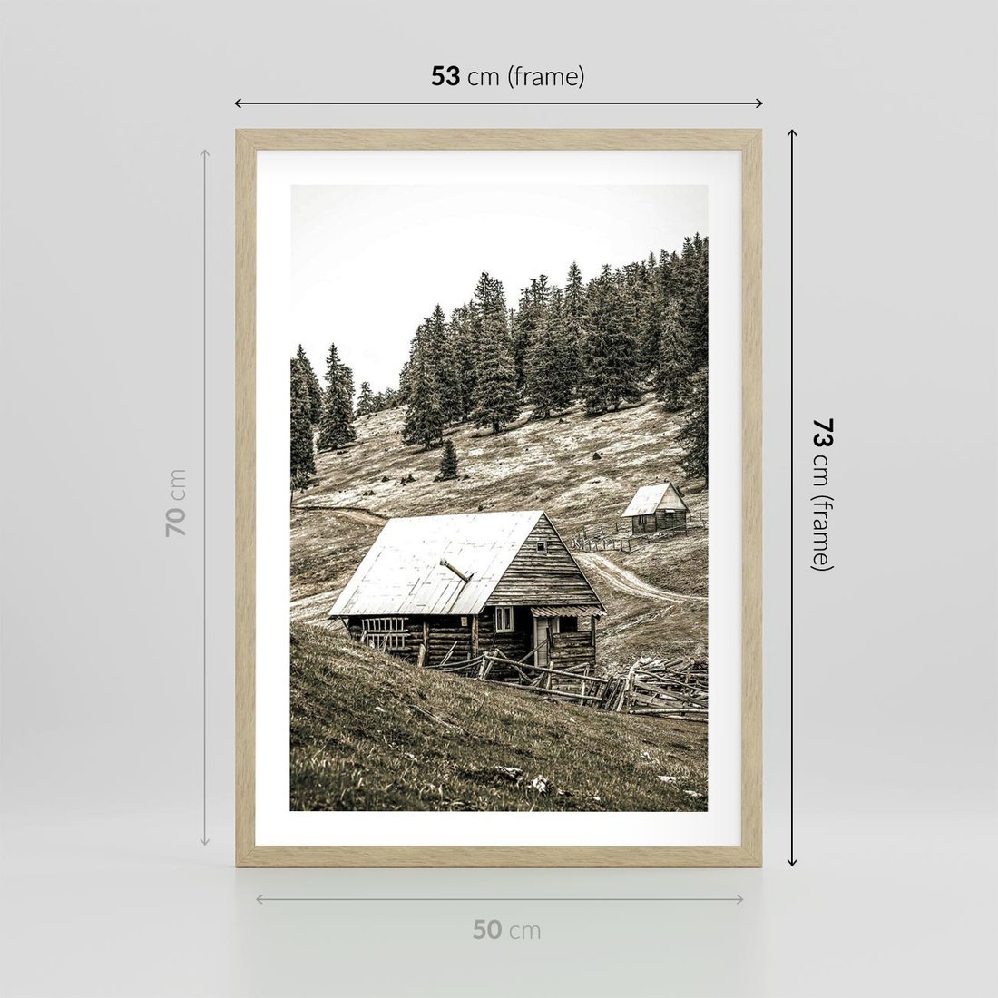 Plakat w ramie 50x70 - Ustronne Chatki w Górach - rustykalne domki w górach, sepia - rama drewno