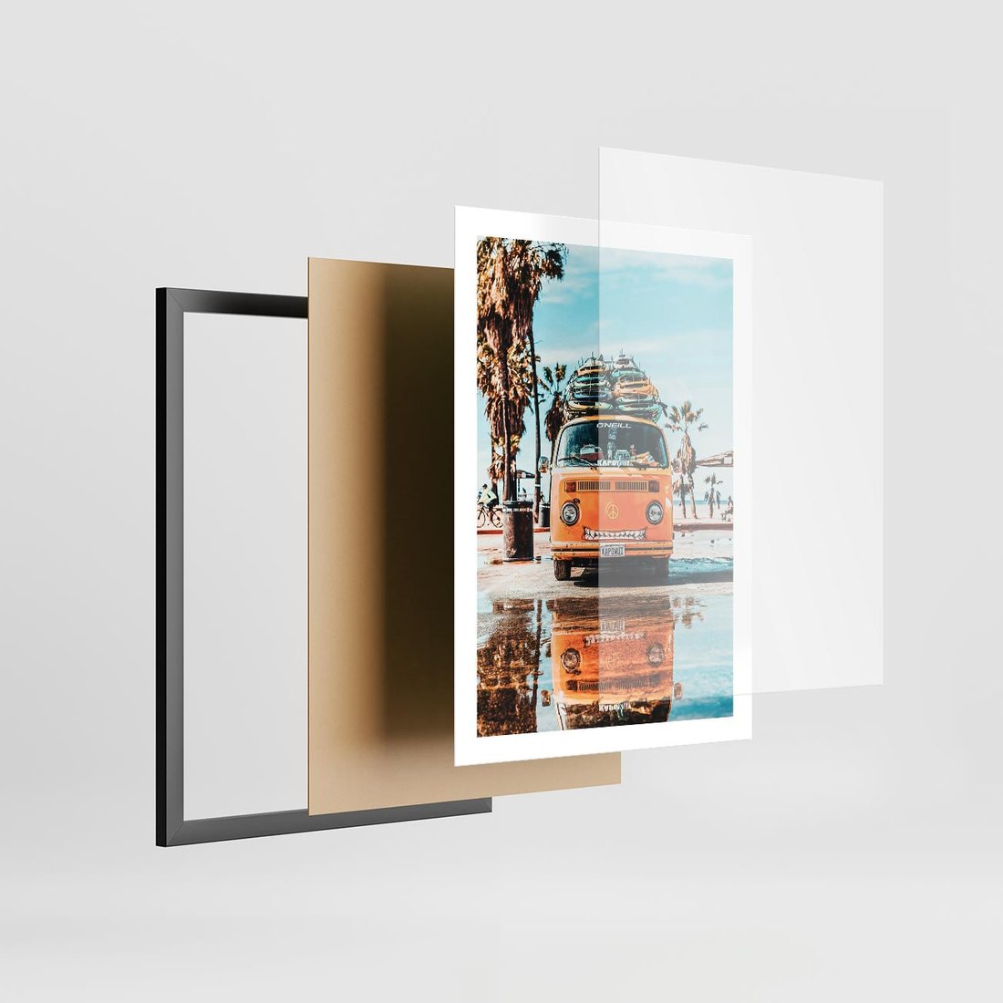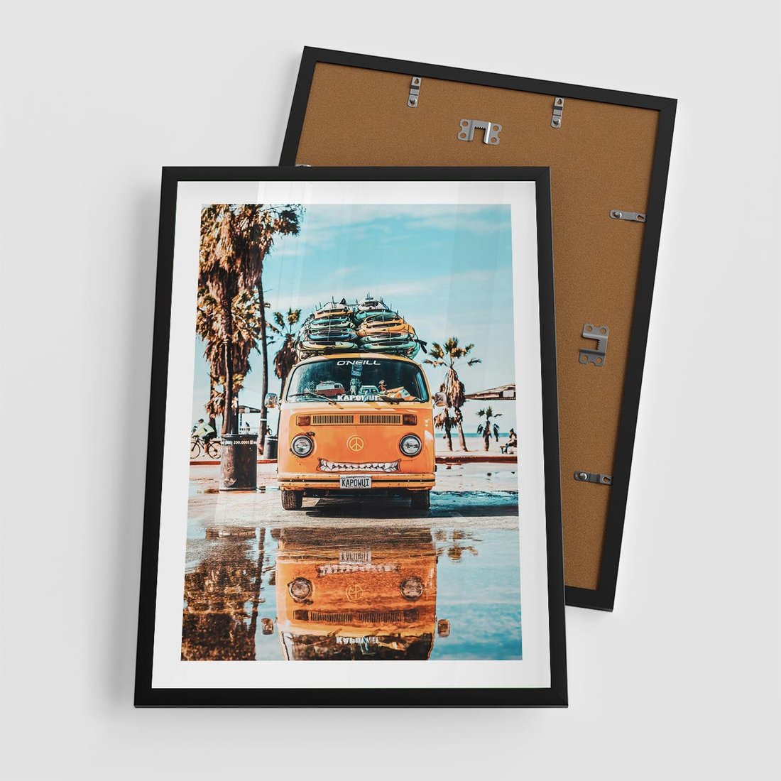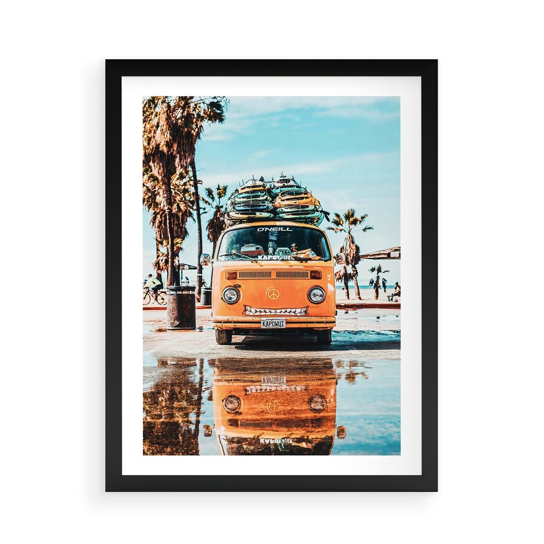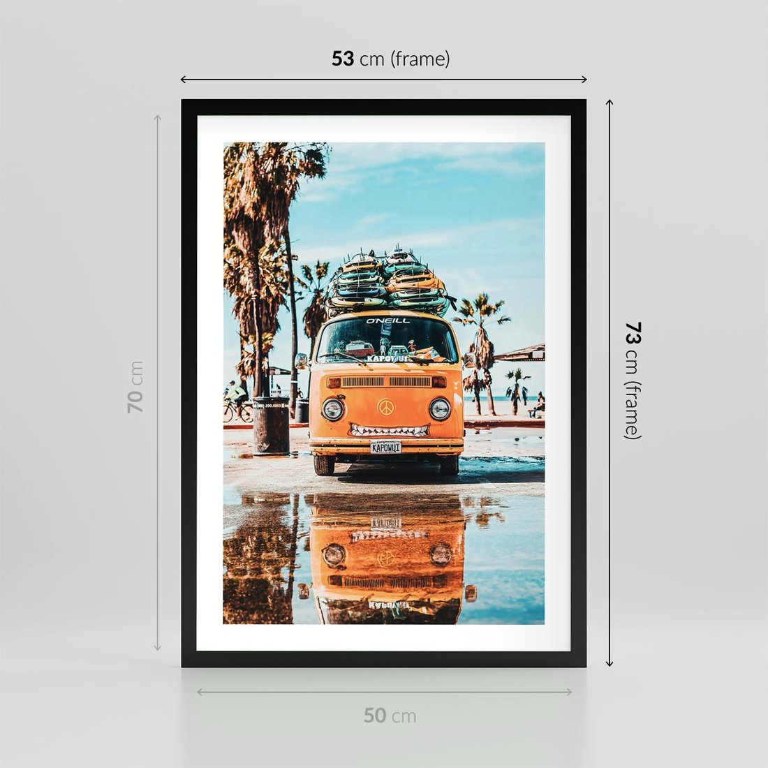 Plakat w ramie 50x70 - Wakacje na Kółkach - kamper, deski surfingowe na dachu - rama czarna