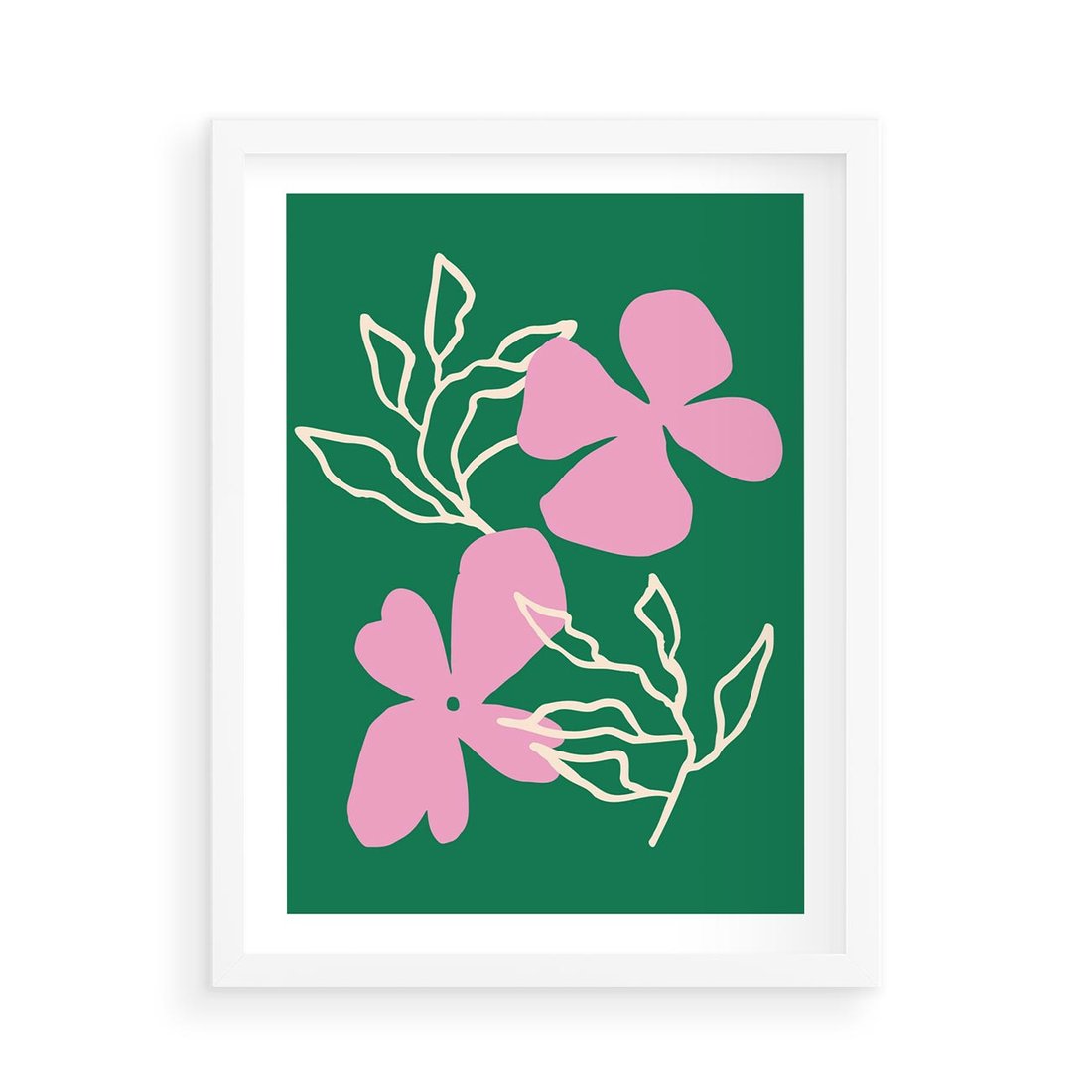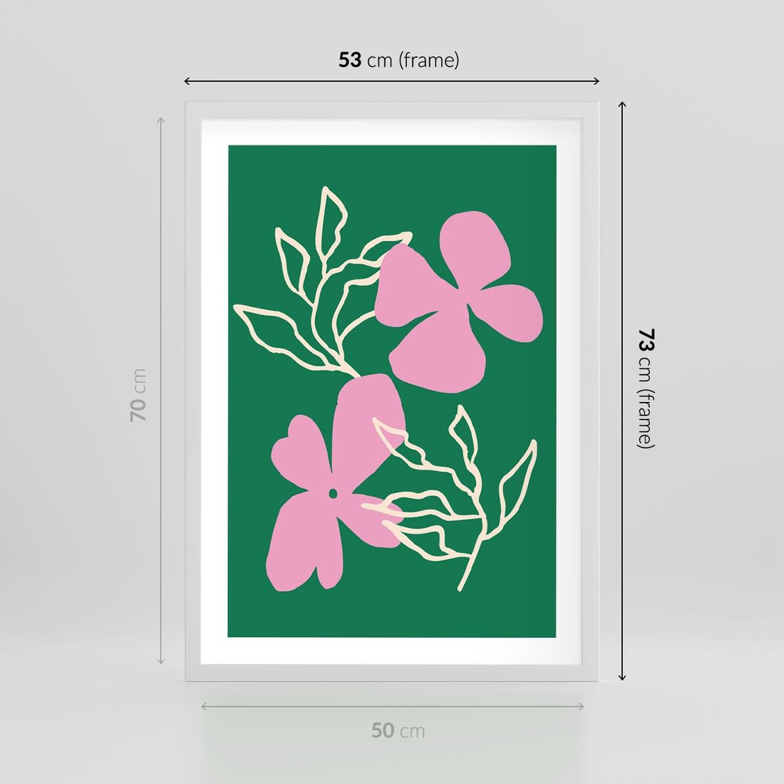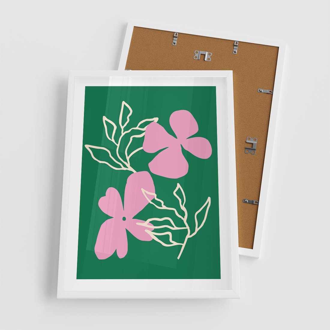 Ten abstrakcyjny plakat w boho stylu ukazuje intensywną zieleń i róż, z delikatnie wkomponowanymi kwiatowymi motywami. Idealnie pasuje do biura, dodając odrobinę natury i artystycznej energii, tworząc inspirujące otoczenie do pracy i twórczego myślenia.