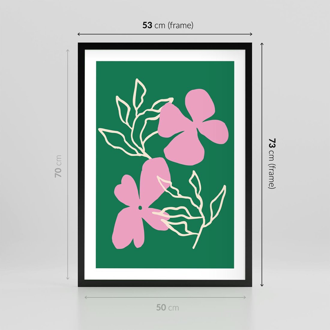 Ten abstrakcyjny plakat w boho stylu ukazuje intensywną zieleń i róż, z delikatnie wkomponowanymi kwiatowymi motywami. Idealnie pasuje do biura, dodając odrobinę natury i artystycznej energii, tworząc inspirujące otoczenie do pracy i twórczego myślenia.