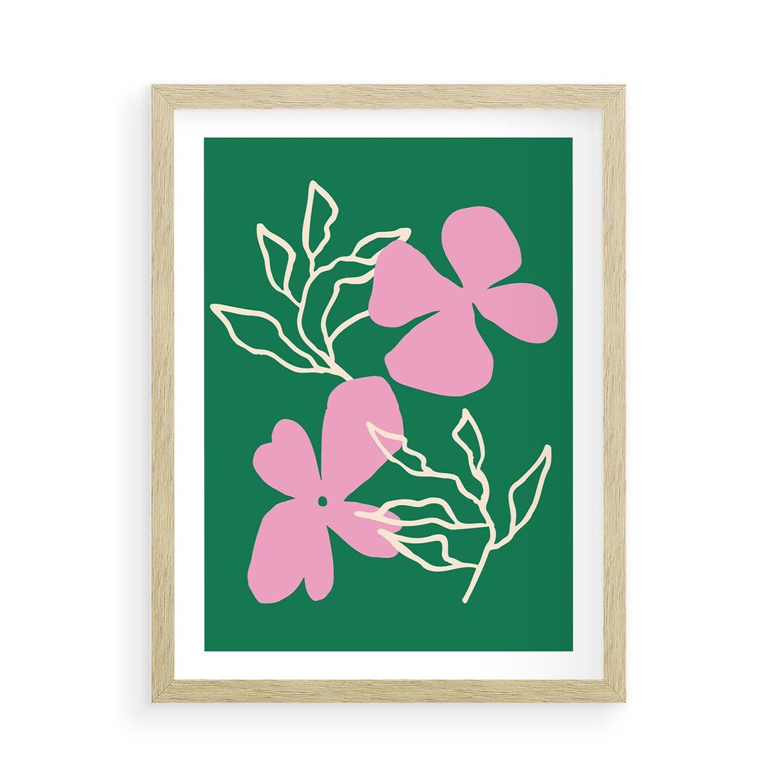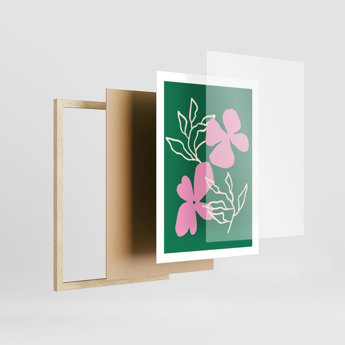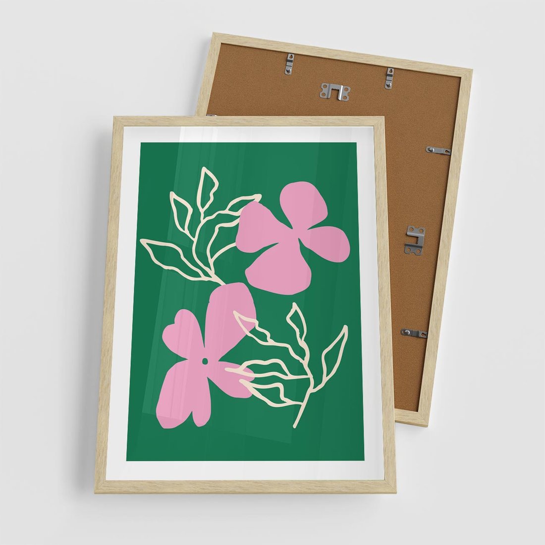 Ten abstrakcyjny plakat w boho stylu ukazuje intensywną zieleń i róż, z delikatnie wkomponowanymi kwiatowymi motywami. Idealnie pasuje do biura, dodając odrobinę natury i artystycznej energii, tworząc inspirujące otoczenie do pracy i twórczego myślenia.