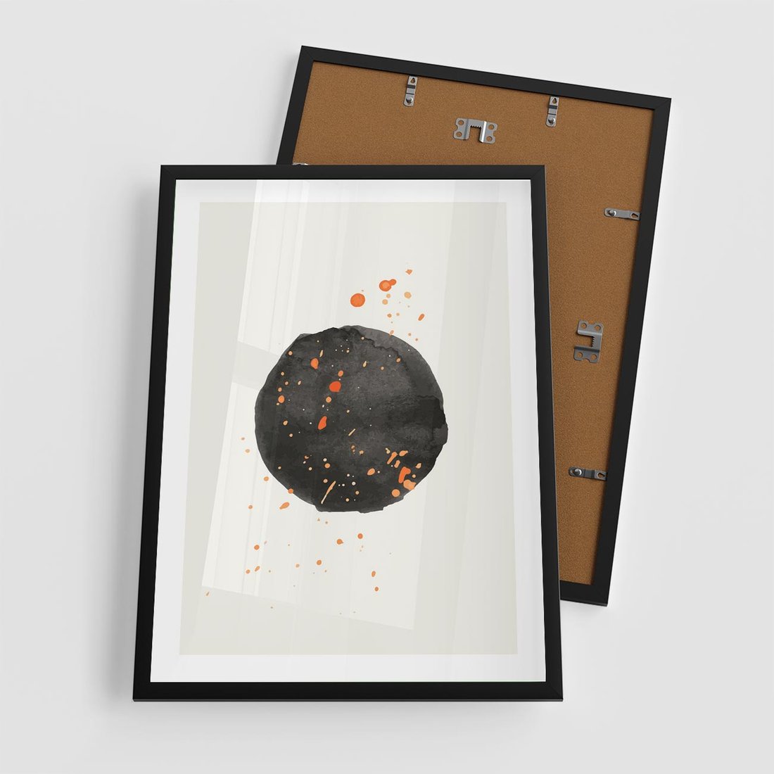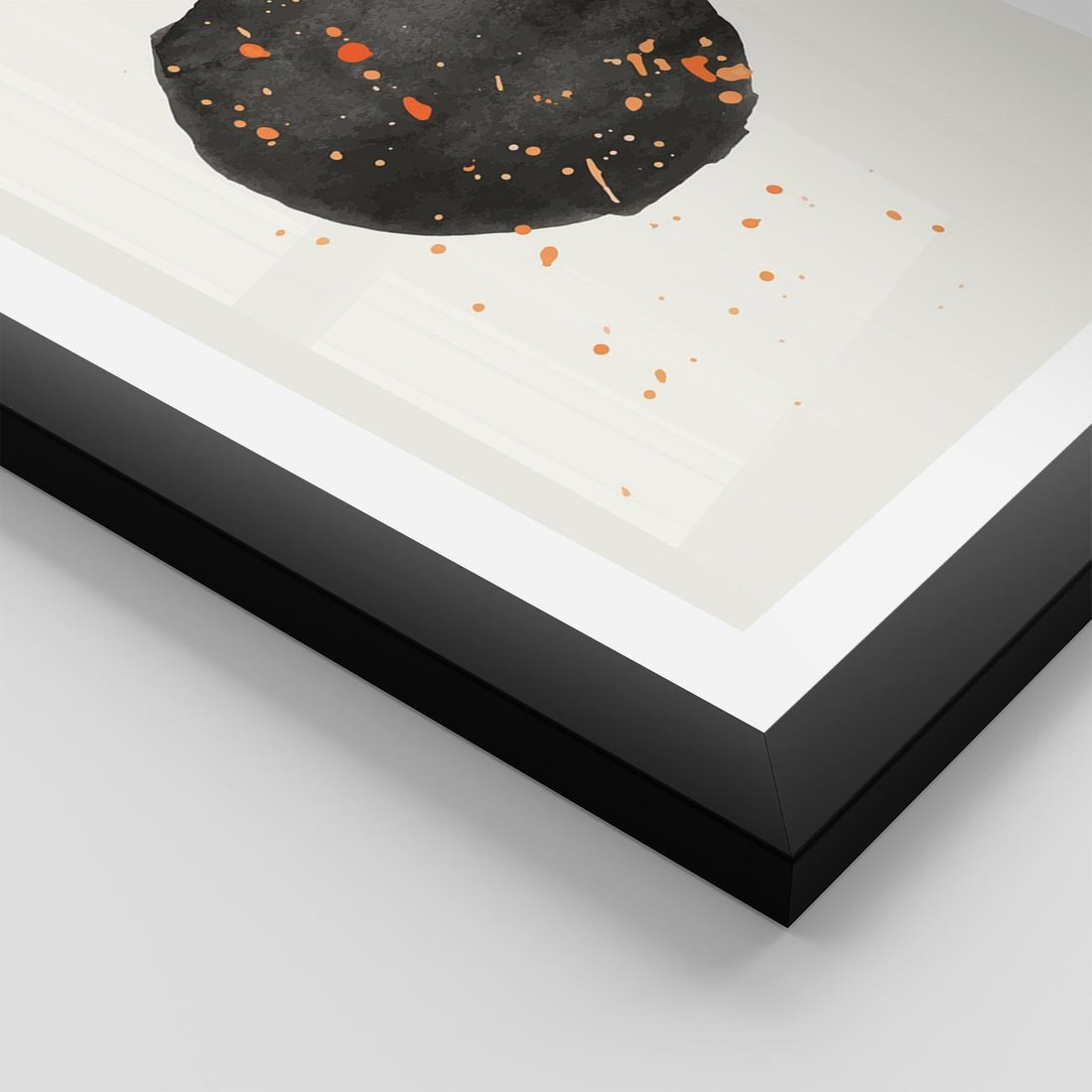Oryginalny obraz to połączenie abstrakcyjnej czarnej plamy z delikatnie rozsianymi pomarańczowymi kropkami. Minimalistyczny styl i mocny akcent tworzą wyjątkową nowoczesną sztukę.