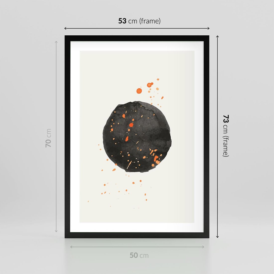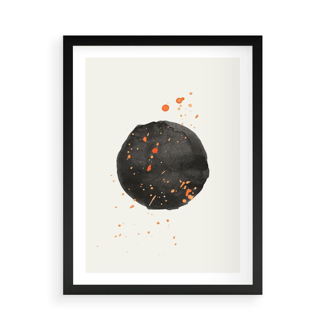 Plakat w ramie 50x70 - Wibracje Kolorów - abstrakcyjna czarna plama, rozsiane pomarańczowe kropki - rama czarna