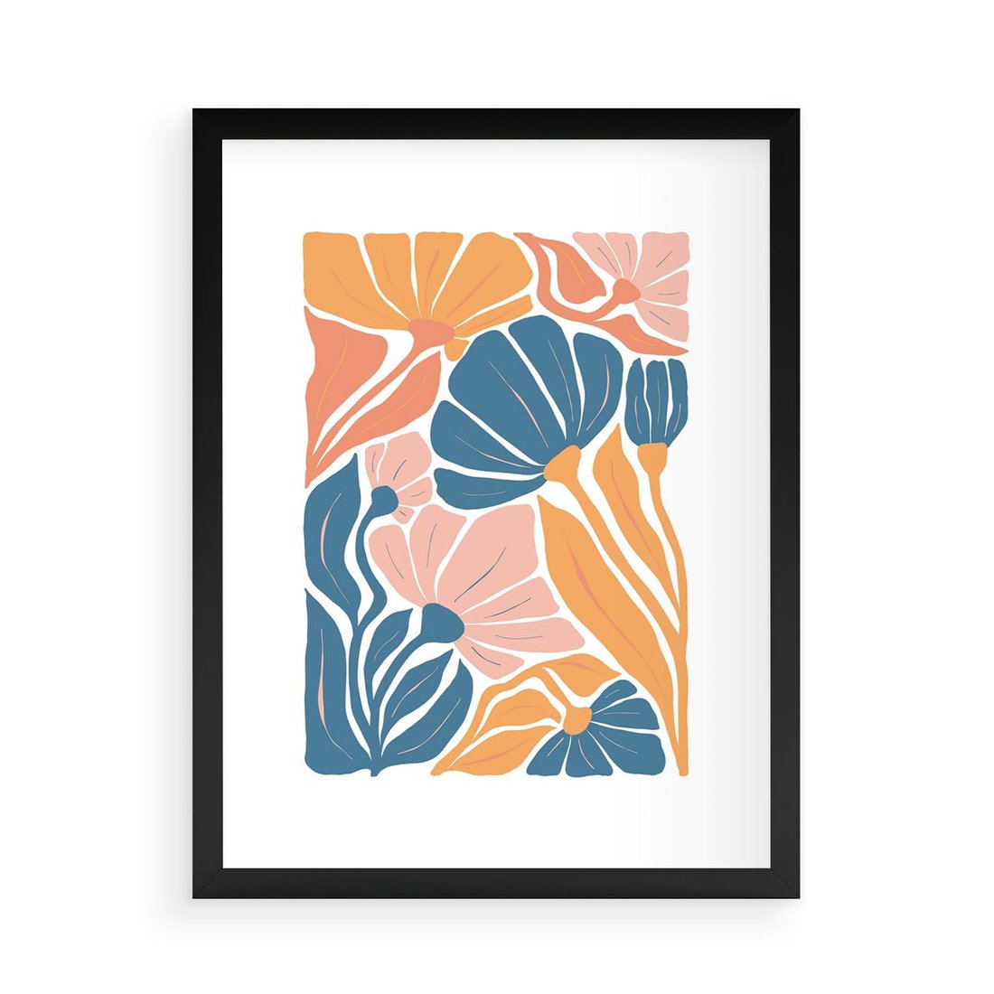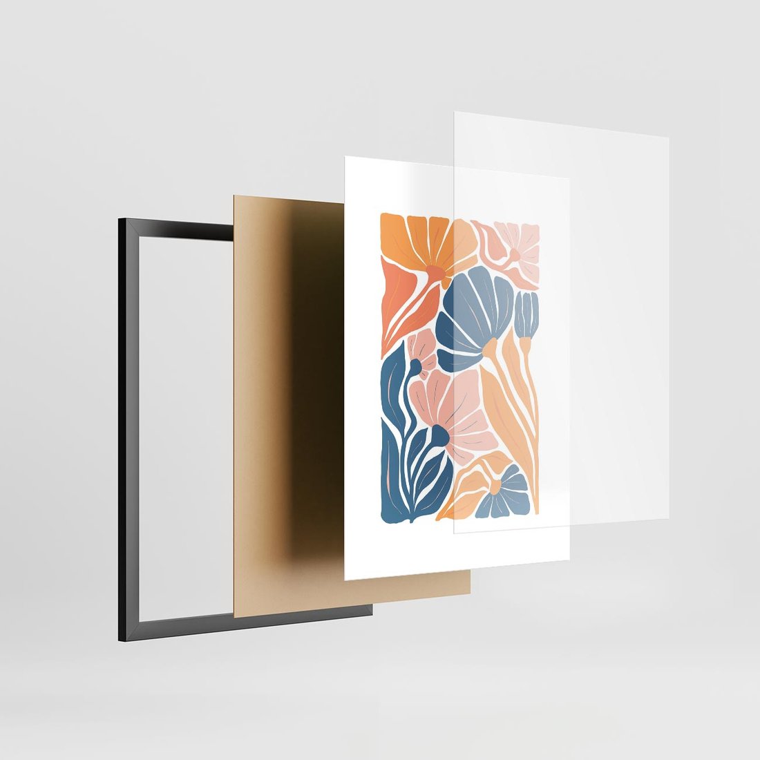 Ta nowoczesna grafika w pastelowych odcieniach niebieskiego, pomarańczowego i różowego ożywia przestrzeń kwiatowym urokiem. To dynamiczna kompozycja, która wnosi do wnętrza subtelne i radosne akcenty. Obraz ten jest wspaniałym sposobem na wprowadzenie kolorowej i nowoczesnej energii natury do Twojego otoczenia.