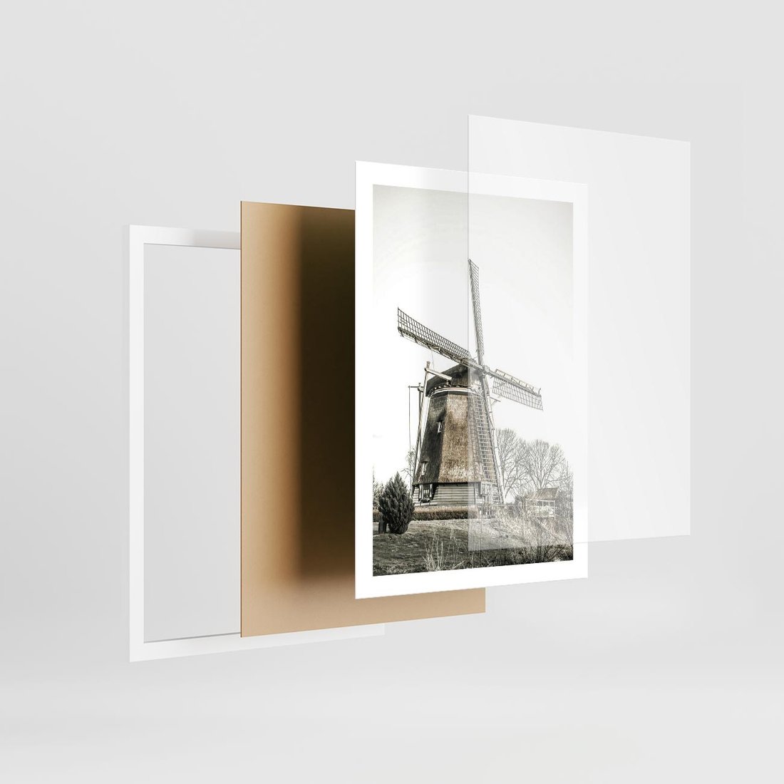 Obraz przedstawia wiejski krajobraz z wiatrakiem lub młynem w odcieniach sepii, co nadaje mu nostalgiczny i klasyczny charakter.