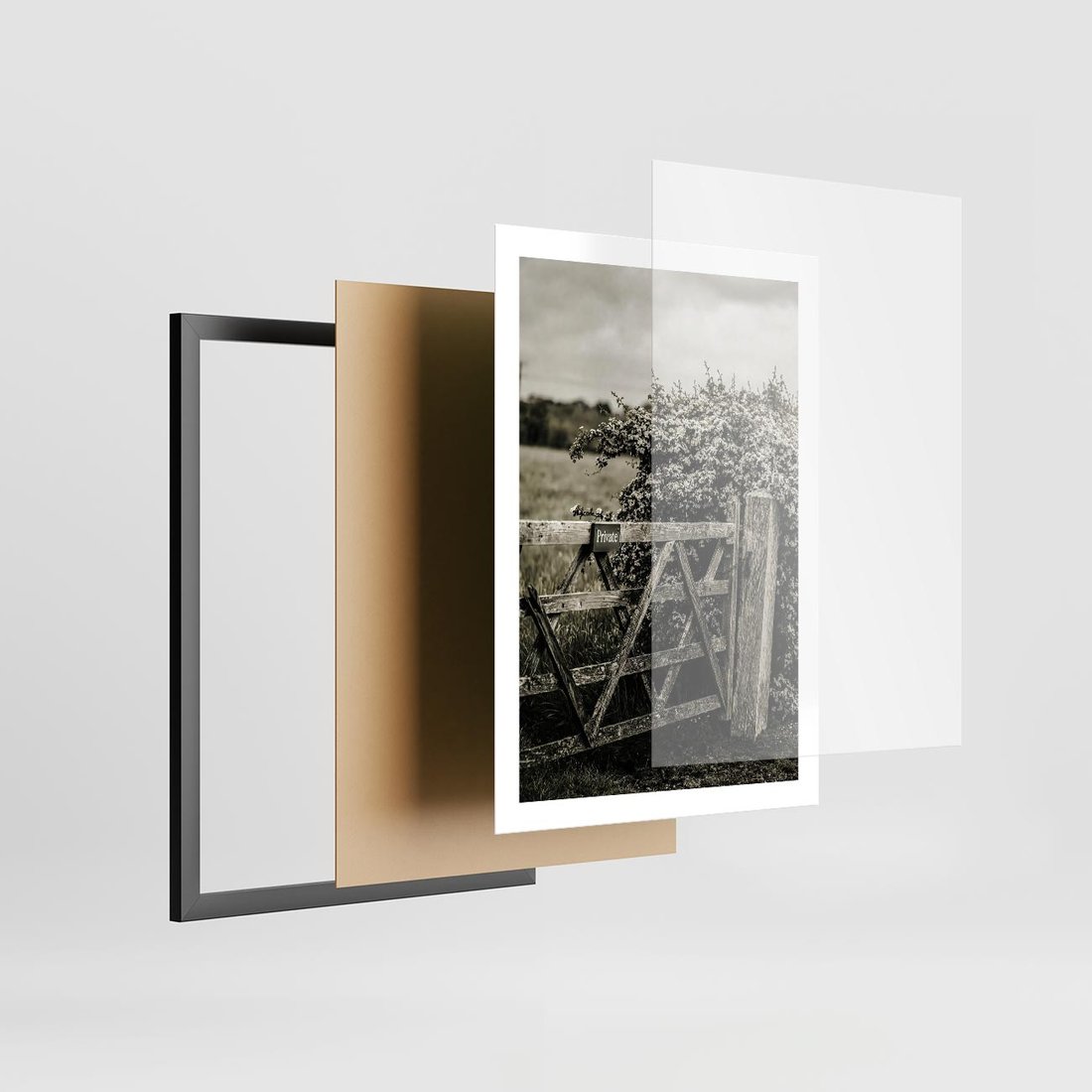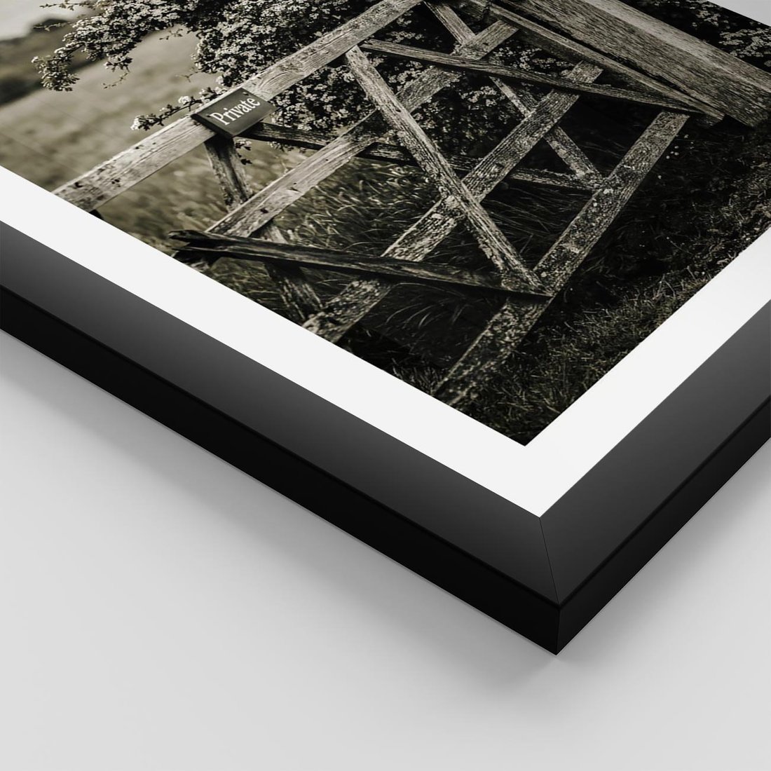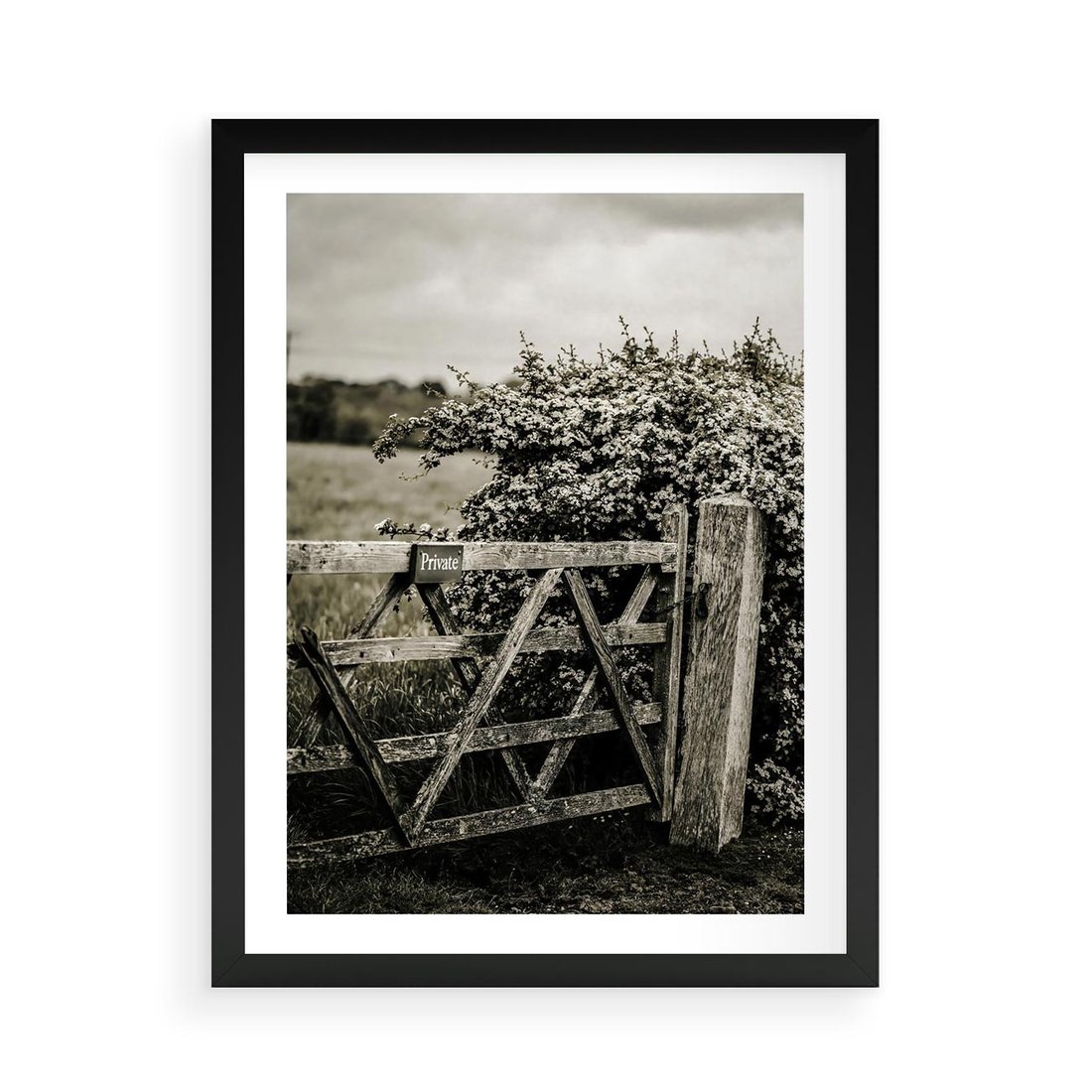 Plakat w ramie 50x70 - Wiejski Urok: Stary Płot i Kwitnący Krzew - rustykalne zdjęcie, stary płot - rama czarna