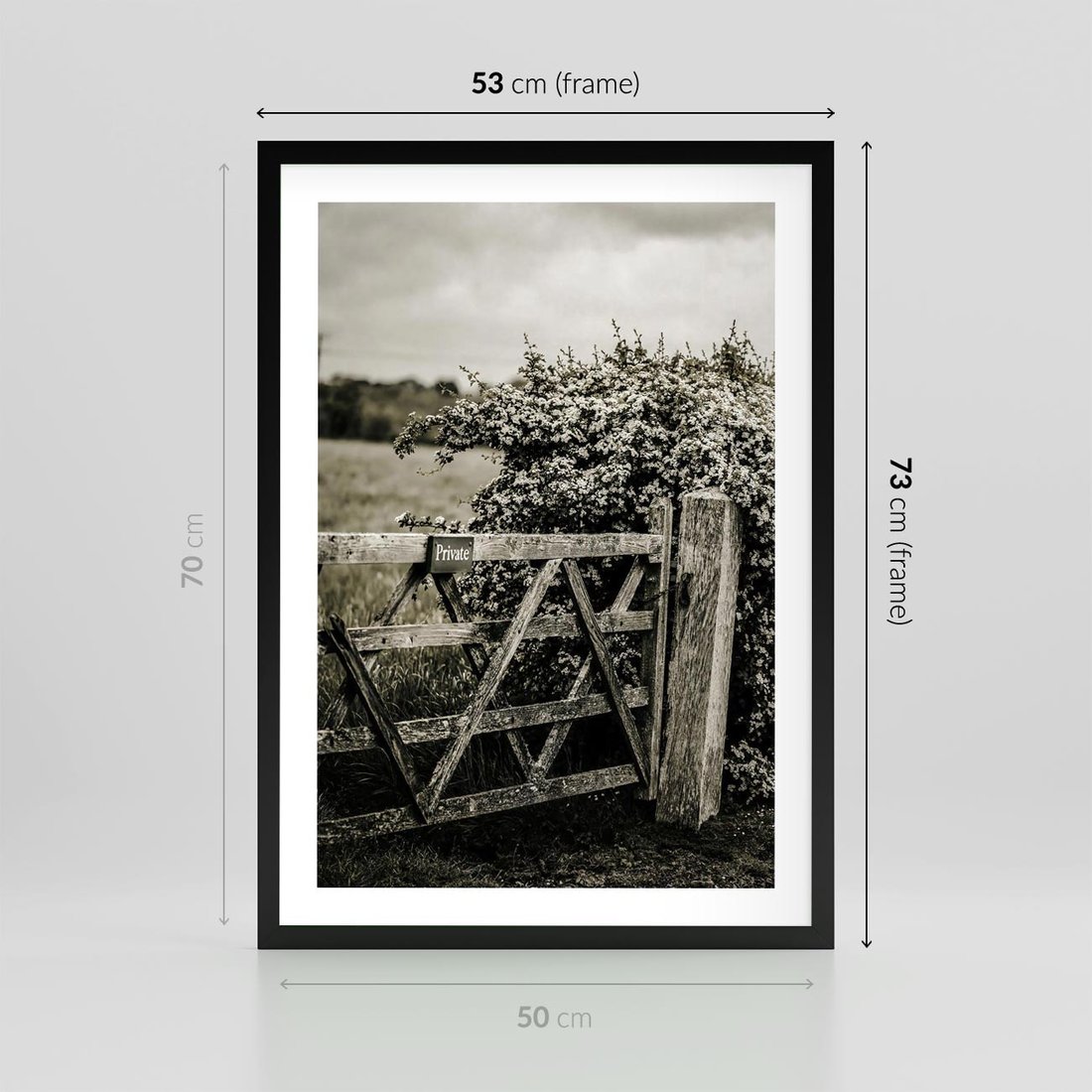 - Plakat w ramie 50x70 - Wiejski Urok: Stary Płot i Kwitnący Krzew