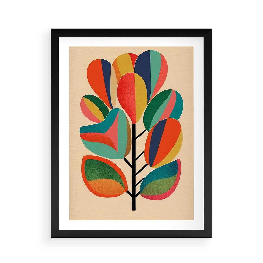 Ten abstrakcyjny obraz ożywa intensywnymi kolorami tęczy, tworząc dynamiczną kompozycję z inspiracją w świecie roślin. Splot różnorodnych form i barw przywołuje naturę w pełnym blasku, dodając wyjątkowego uroku każdemu wnętrzu.