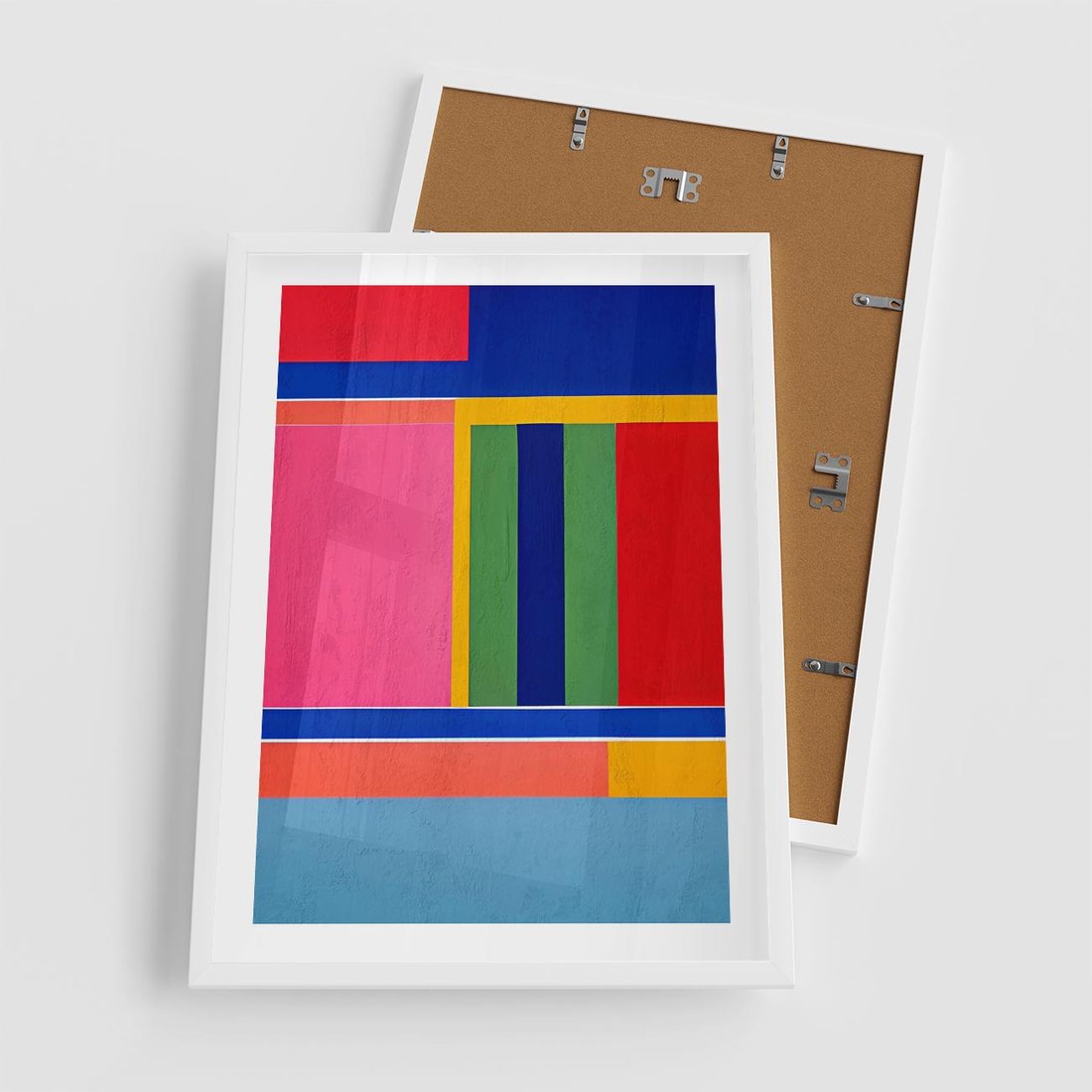 Plakat w ramie 50x70 - Wnętrza Rozplątanych Barw - abstrakcyjny geometryczny obraz olejny, kolorowe pasy - rama biała