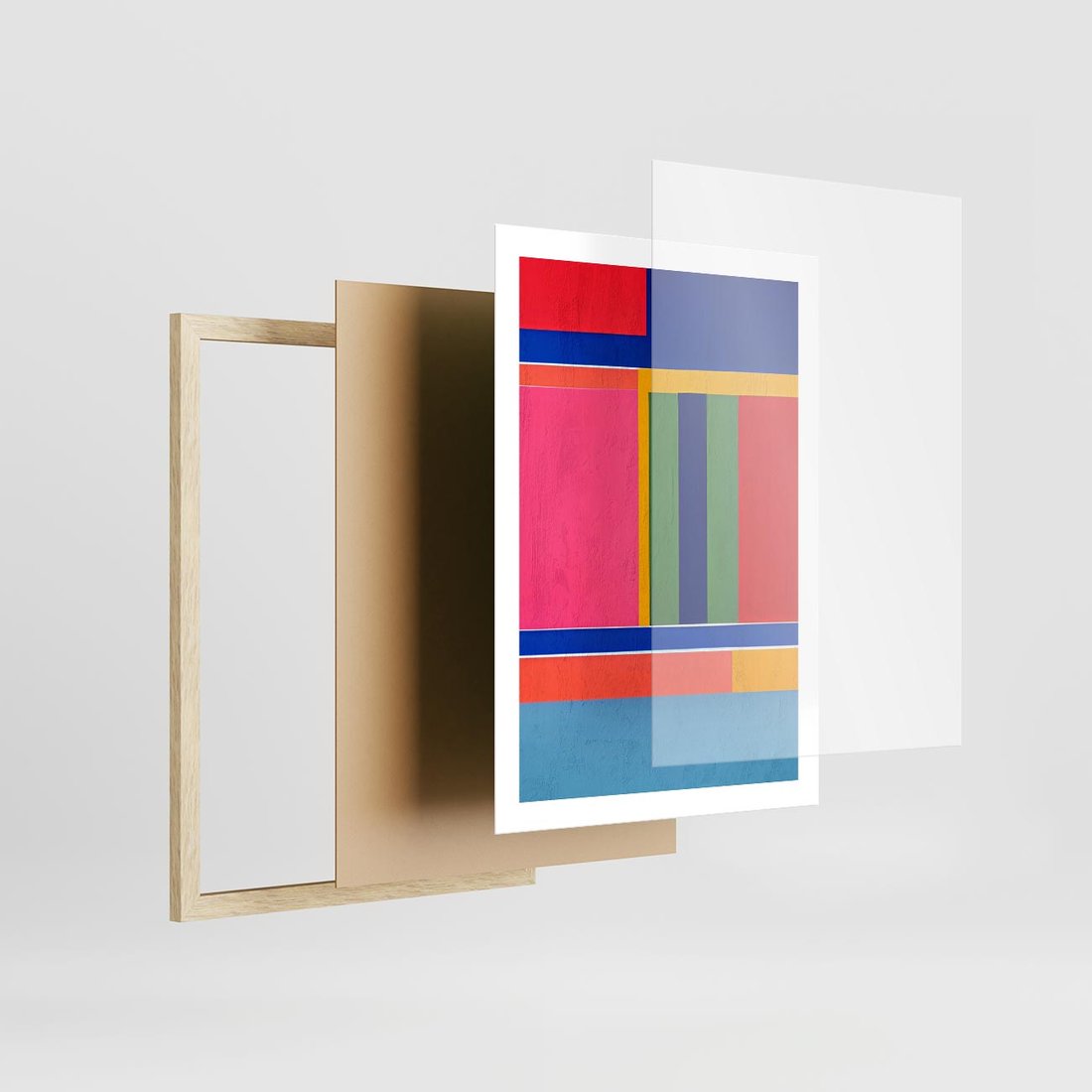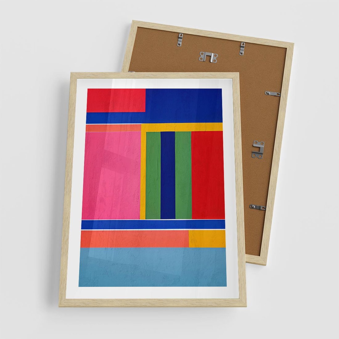 Plakat w ramie 50x70 - Wnętrza Rozplątanych Barw - abstrakcyjny geometryczny obraz olejny, kolorowe pasy - rama drewno