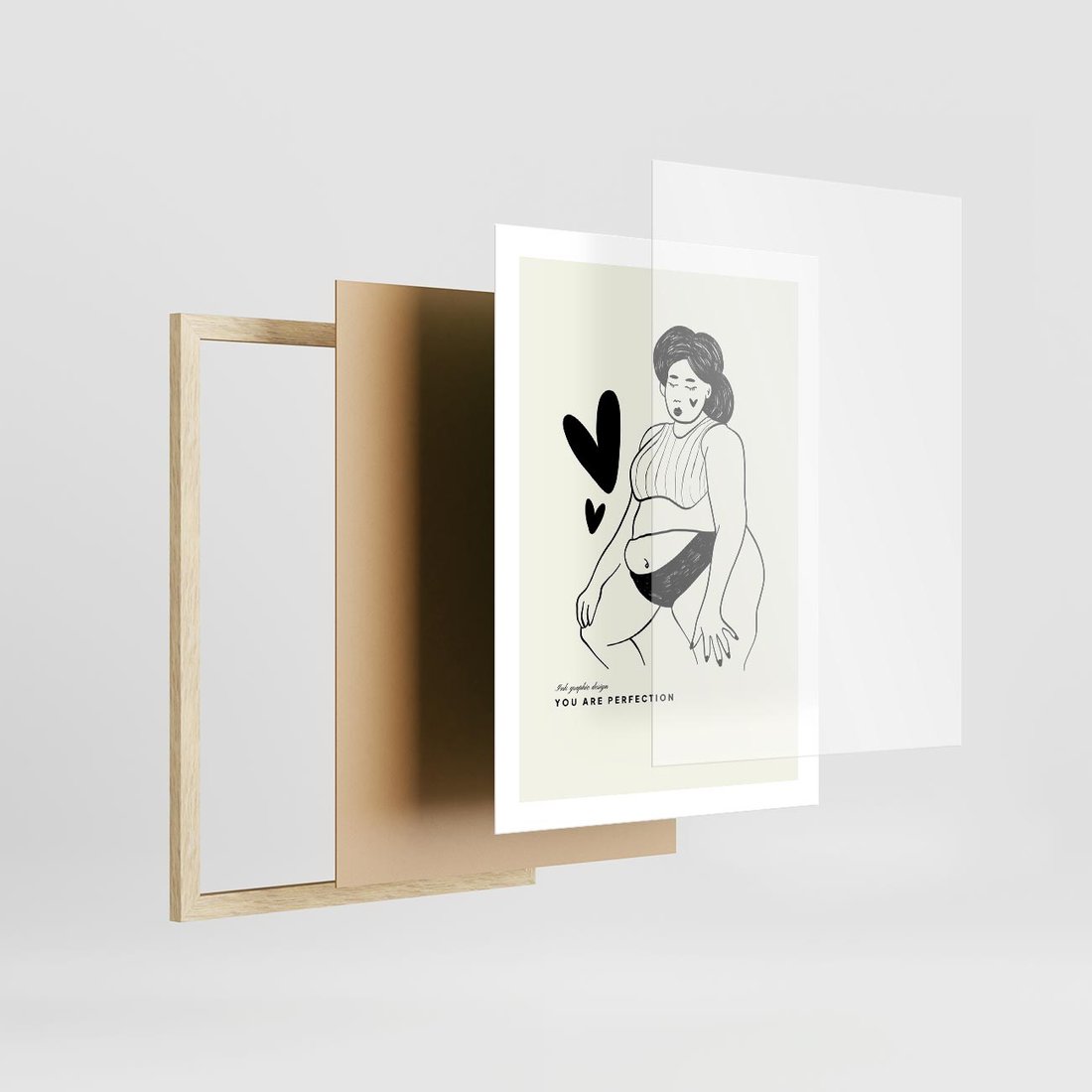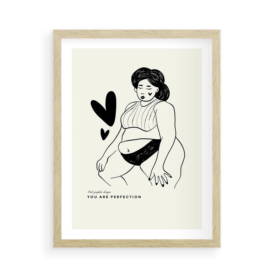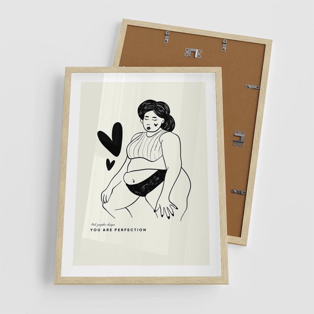 Ta sztuka rysunkowa ukazuje piękno kobiecej sylwetki w bieliźnie. Wzbogacona wyrazistą typografią, przypomina o sile wyrażania indywidualnego piękna i pewności siebie.