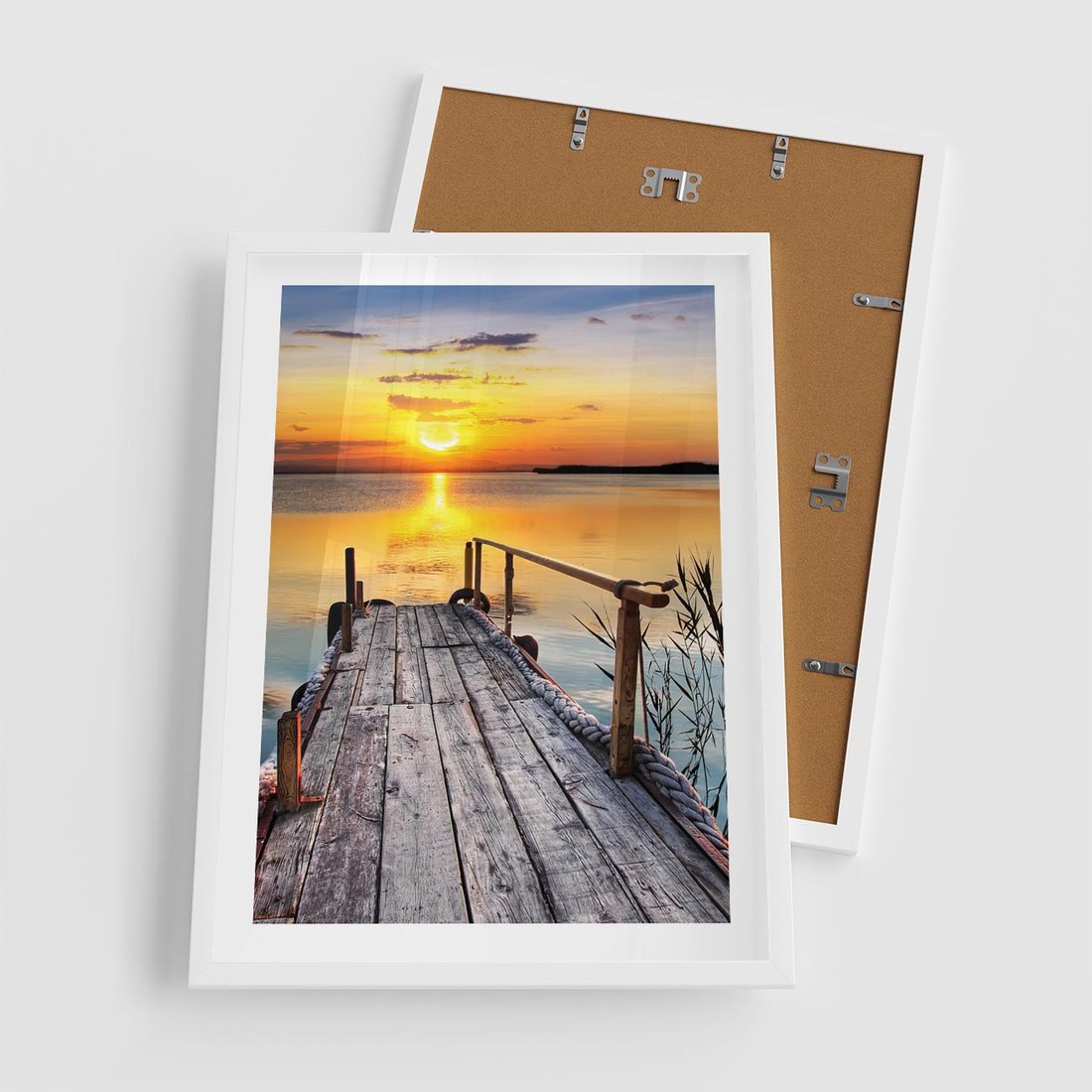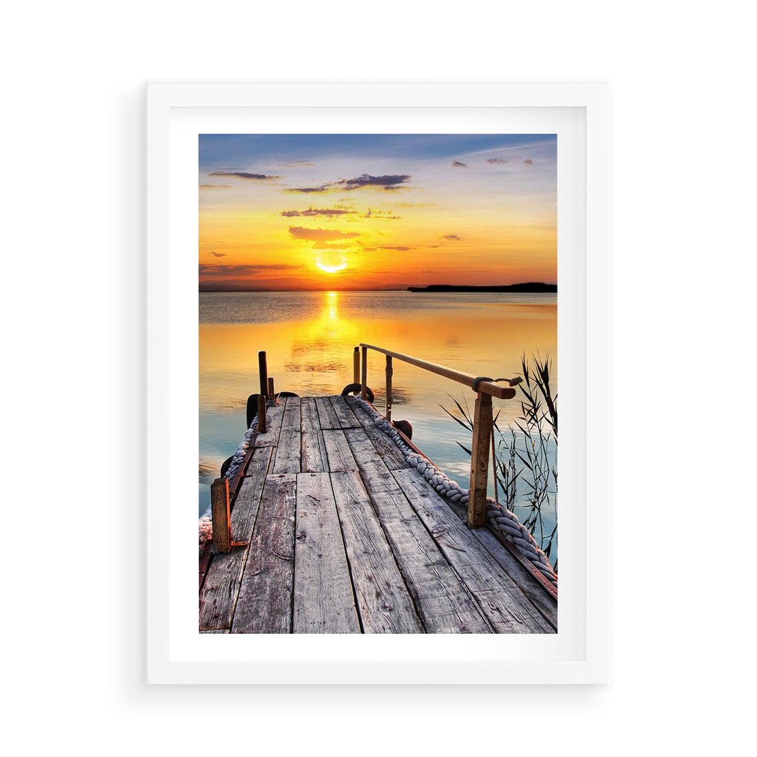 Plakat w ramie 50x70 - Zachód nad jeziorem z pomostem - pomost, jezioro - rama biała