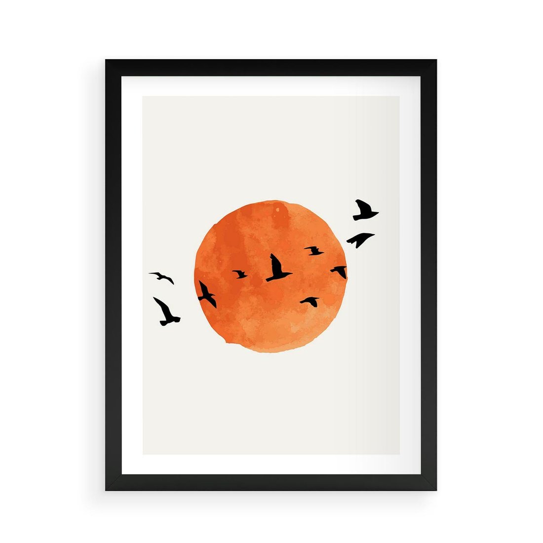 Plakat w ramie 50x70 - Zachód Słońca i Ptaki - grafika akwarela, czarne ptaki na tle zachodu słońca - rama czarna