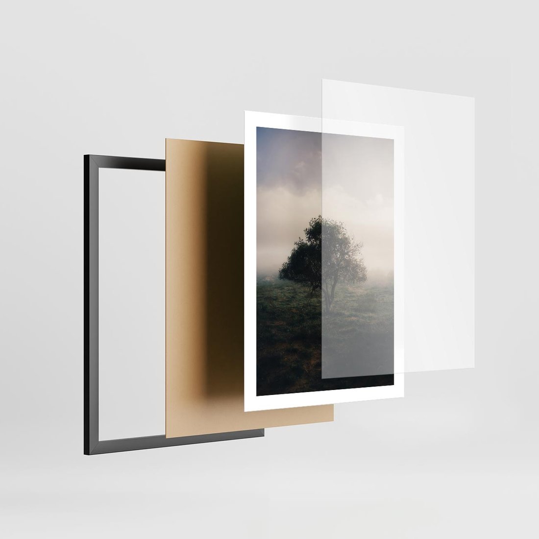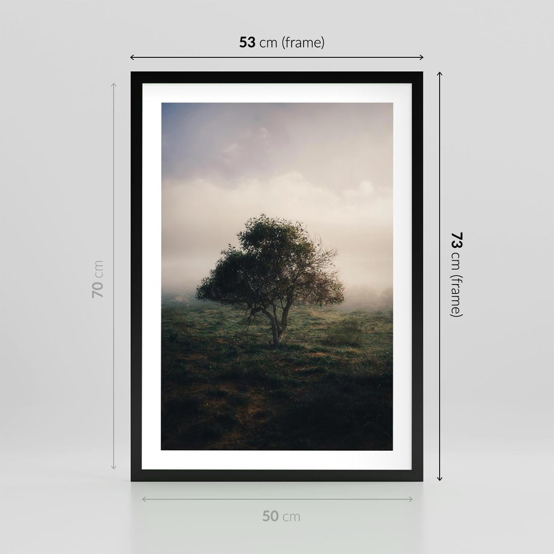 Plakat w ramie 50x70 - Zamglona Prostota - artystyczna fotografia, samotne drzewo na zamglonej łące - rama czarna