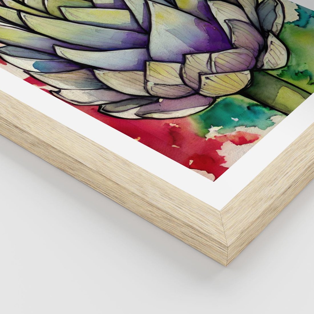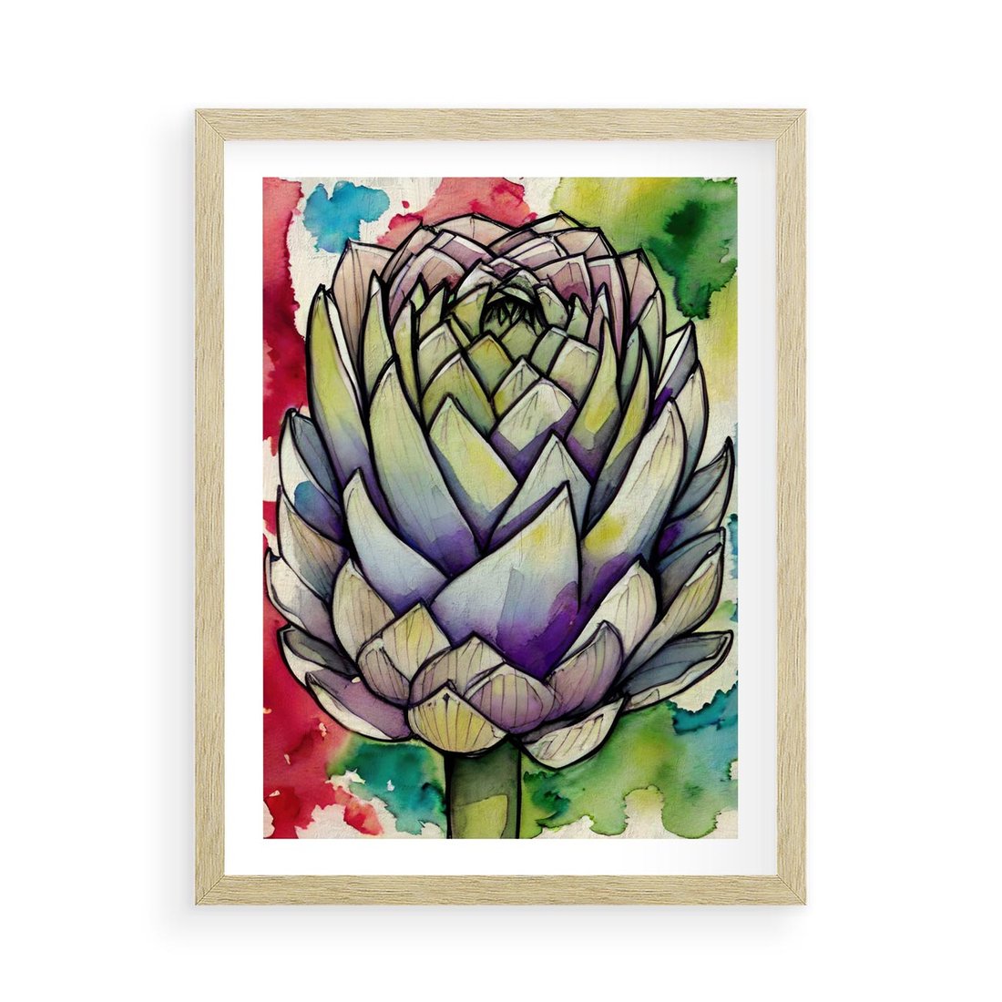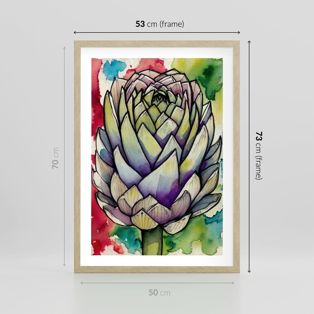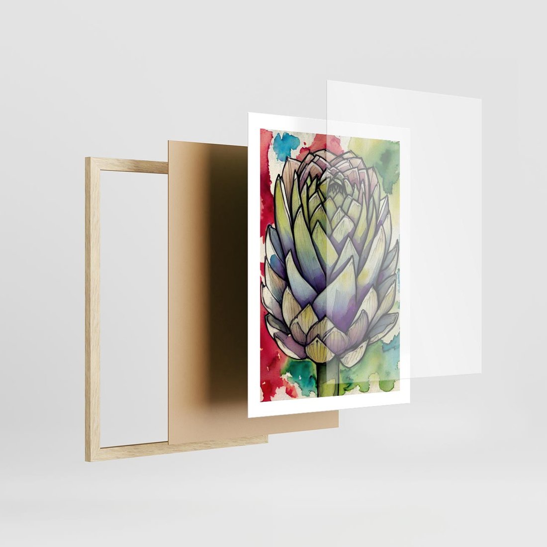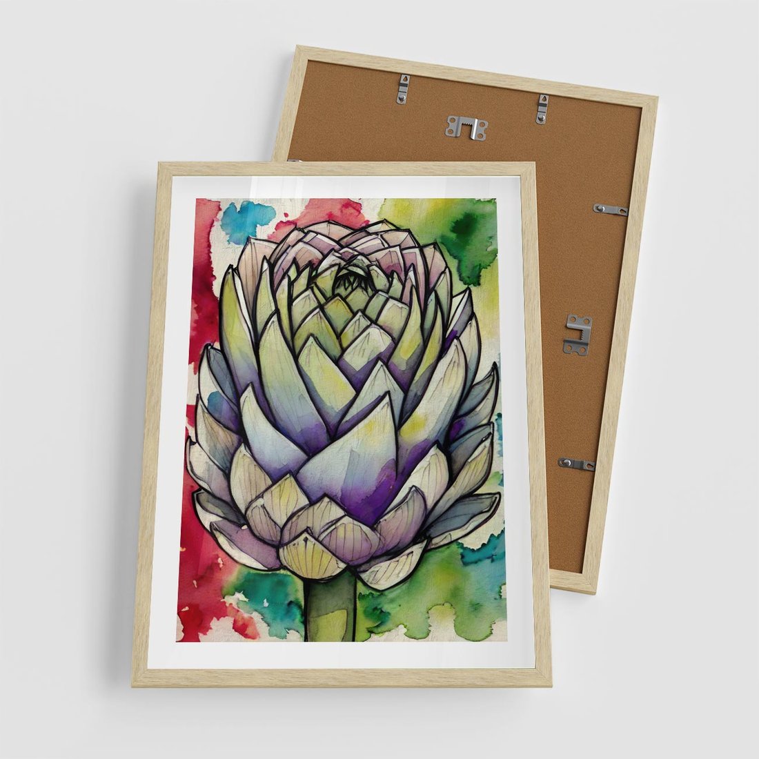 Ten abstrakcyjny obraz akwarelowy ukazuje karczocha w niezwykły i artystyczny sposób. Artysta użył delikatnej techniki akwareli, aby stworzyć kompozycję, która eksperymentuje z formą i kolorem tego egzotycznego warzywa. Barwy i tekstury na obrazie są swobodne, pełne przejść, tworząc wrażenie płynności i lekkości.