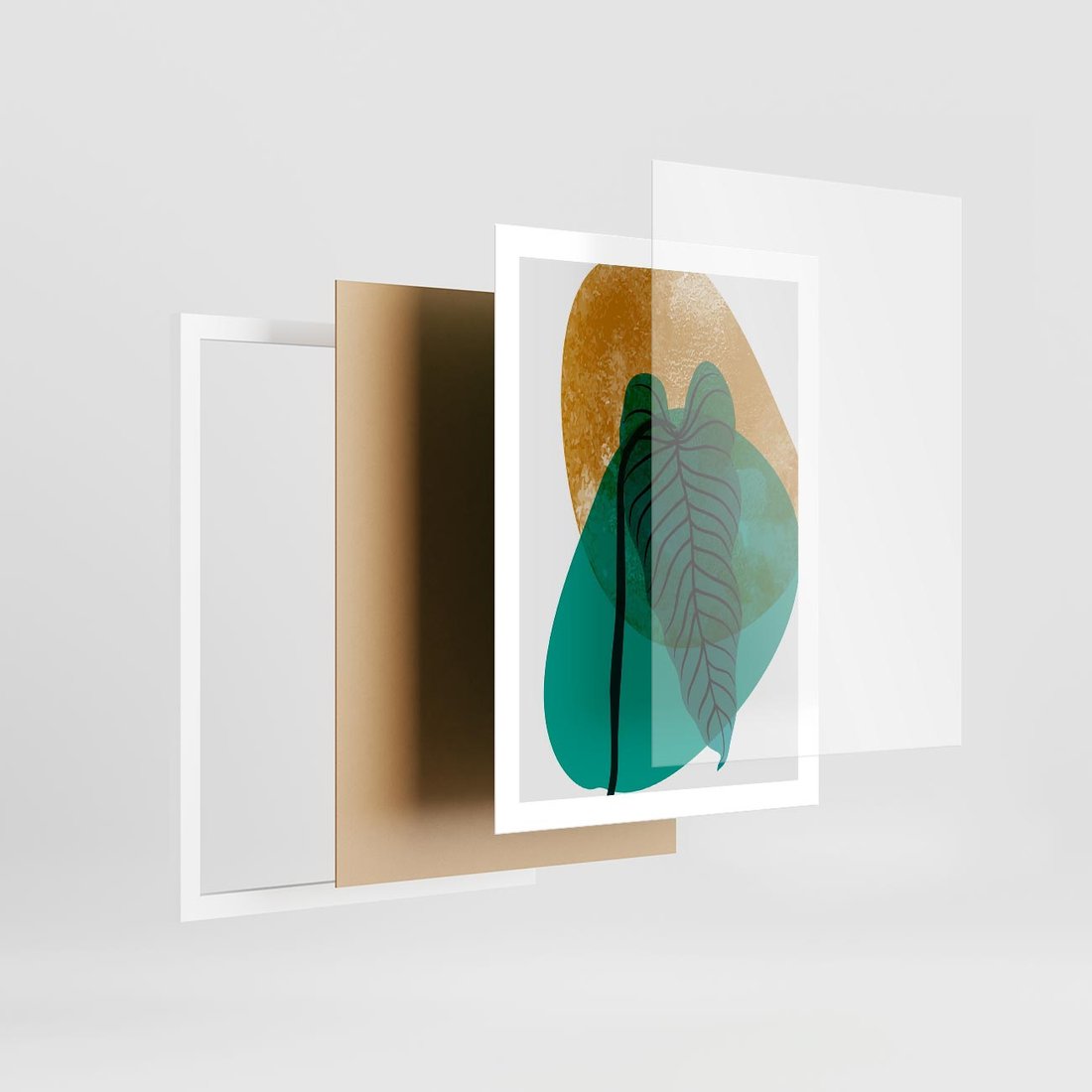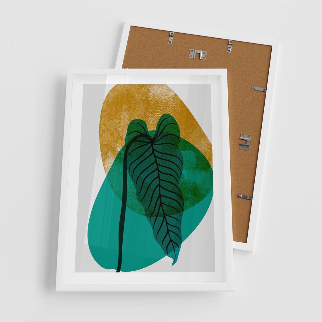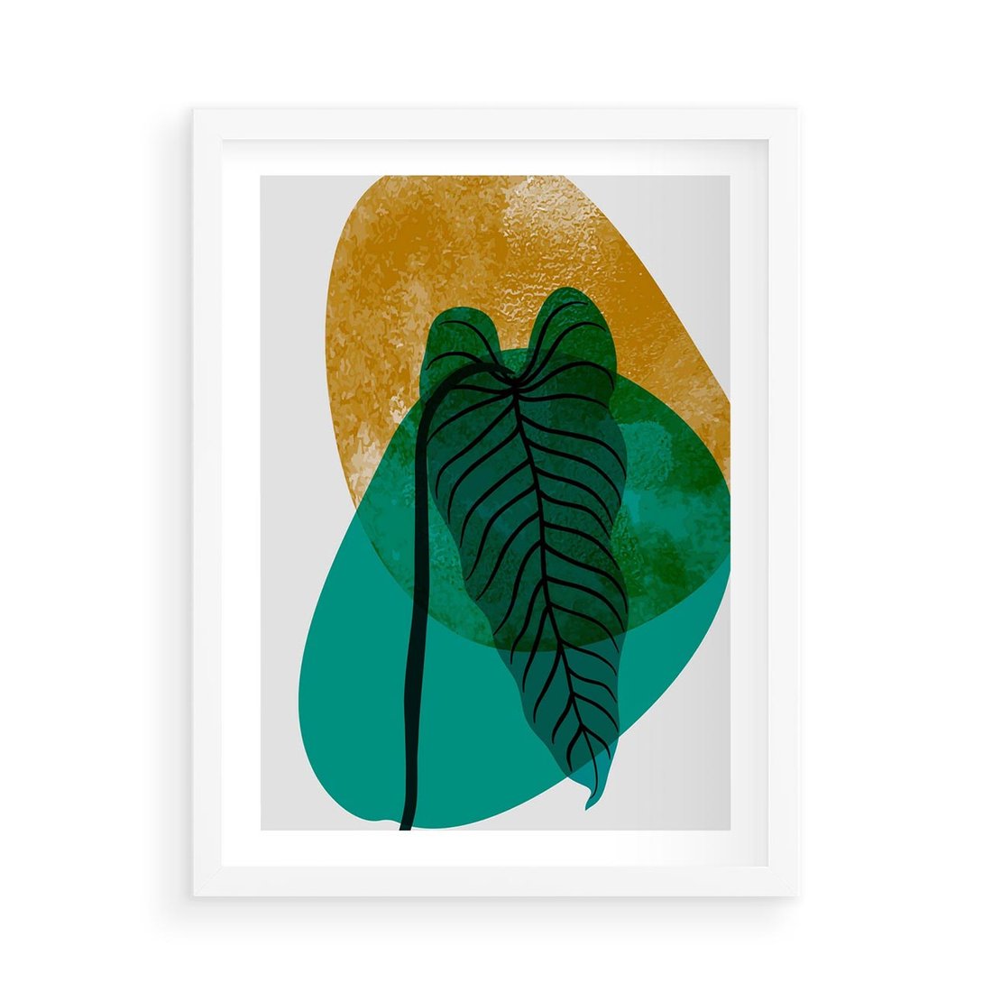 Obraz przedstawia grafikę z zielonym liściem i złotą plamą, tworząc elegancką i harmonijną kompozycję.