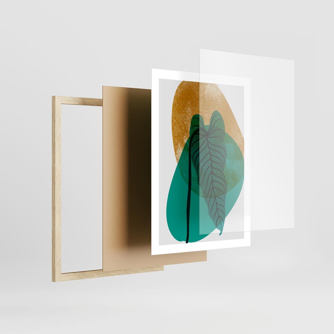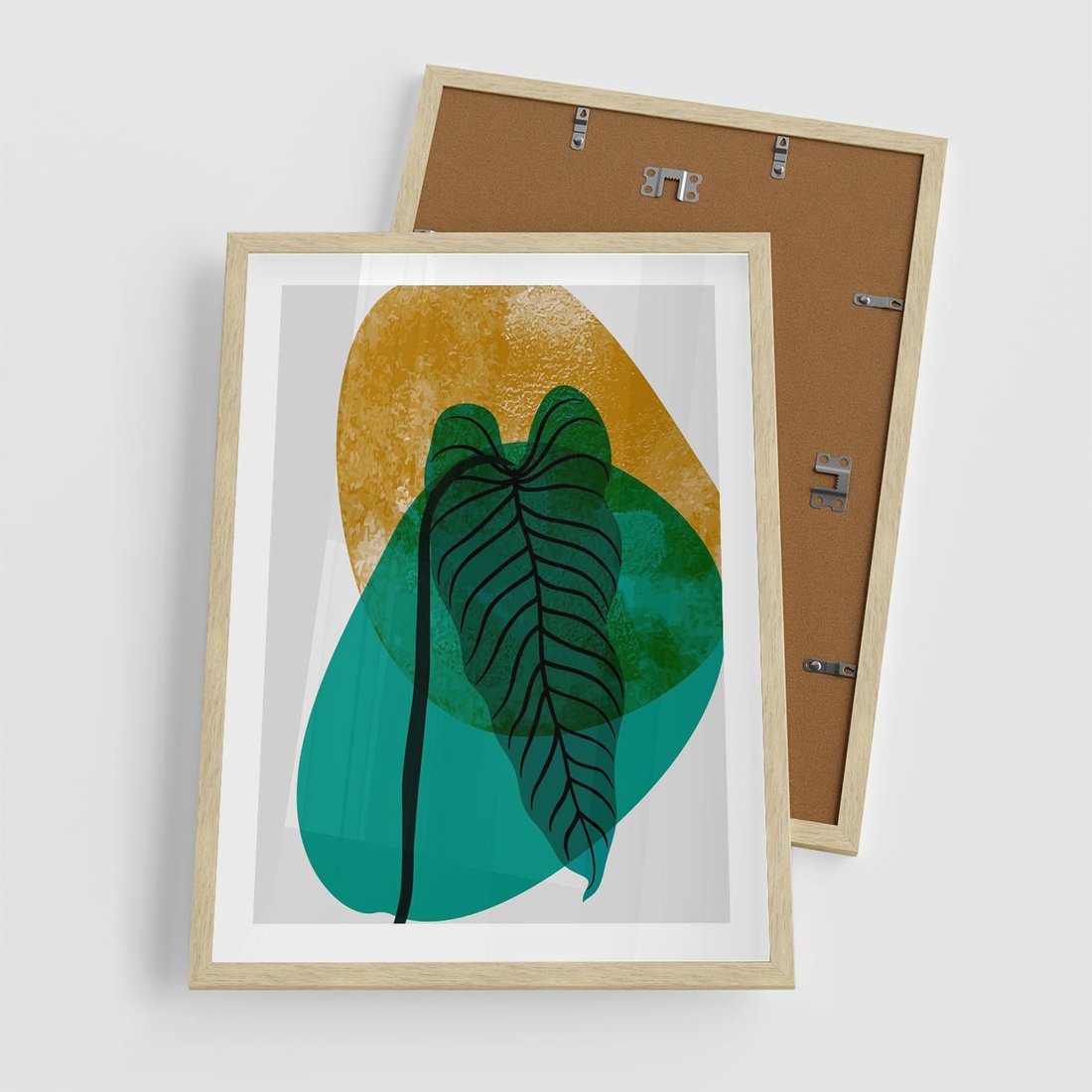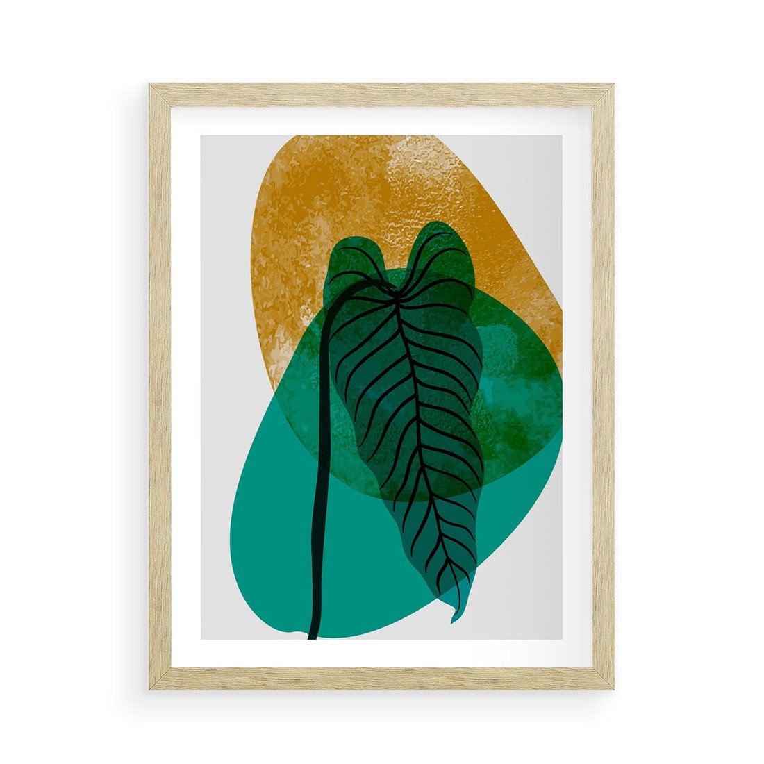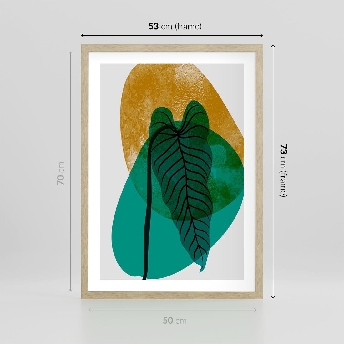 Plakat w ramie 50x70 - Zielony Liść ze Złotą Plamą - zielony liść, złota plama - rama drewno