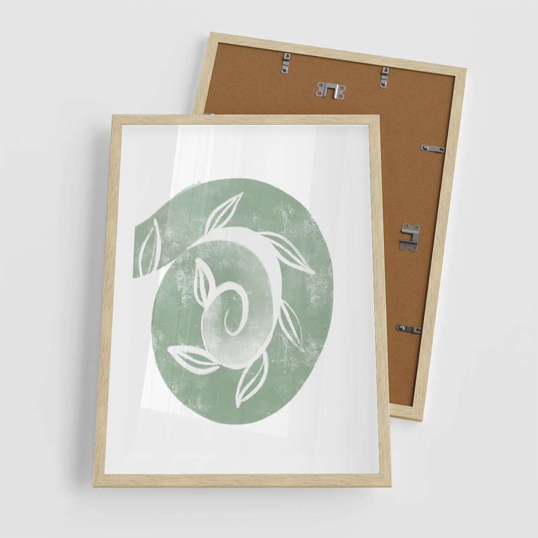 Abstrakcyjny zielony motyw nawiązujący do natury idealnie pasuje do skandynawskiego designu. Ten plakat dodaje świeżości i spokoju do nowoczesnych wnętrz, tworząc harmonijną atmosferę.