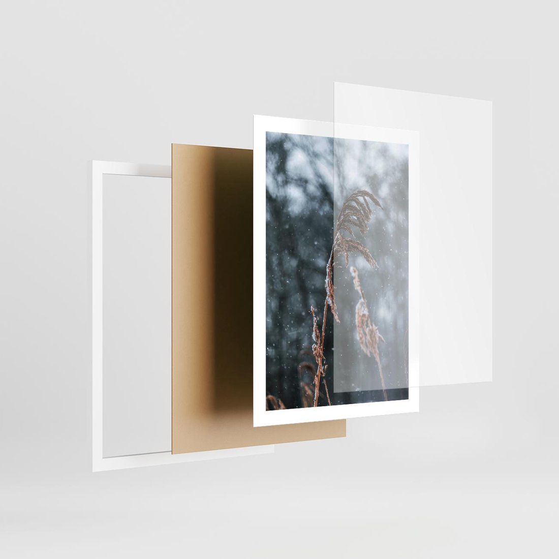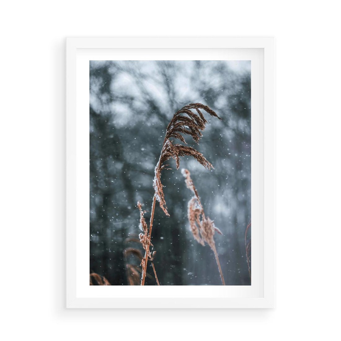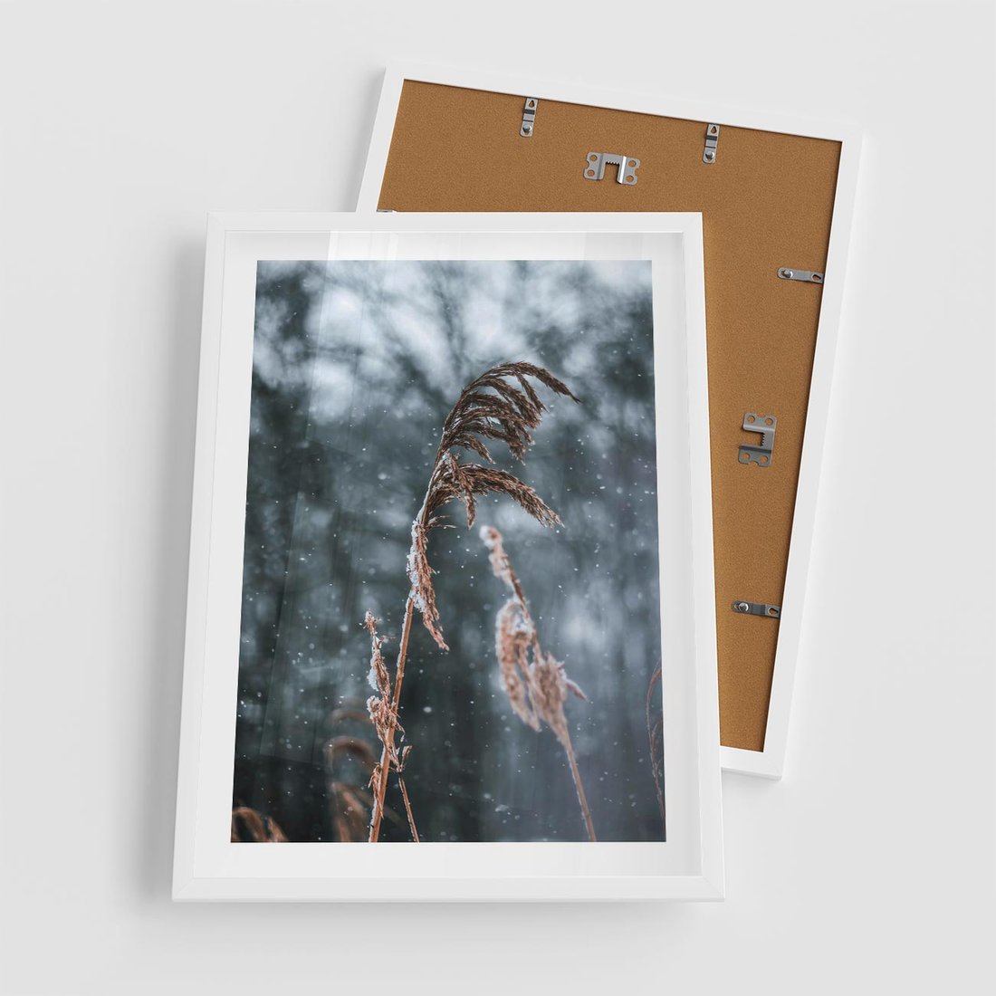Plakat w ramie 50x70 - Zima na Łonie Natury - sucha wysoka trawa, w zimie - rama biała