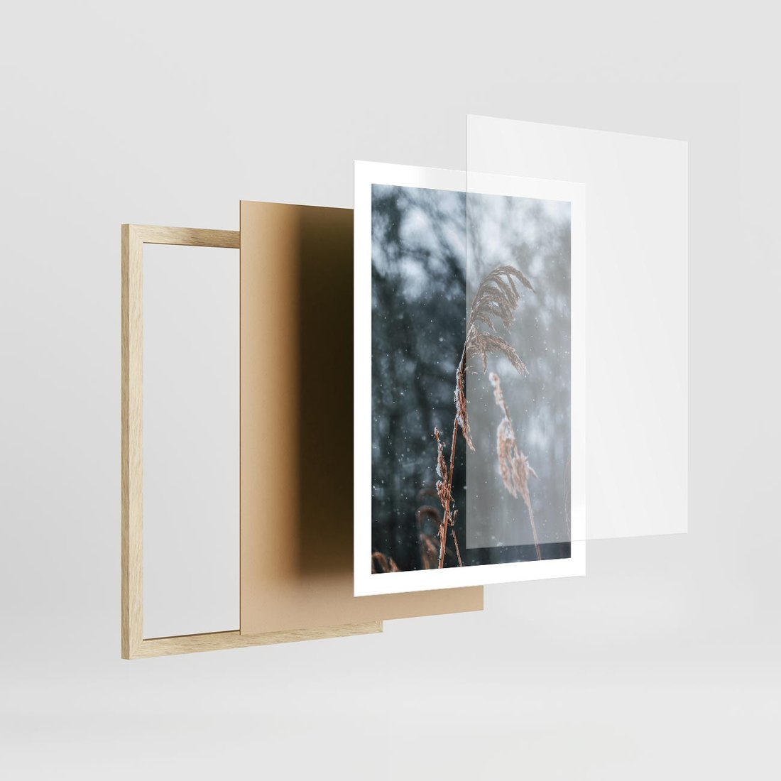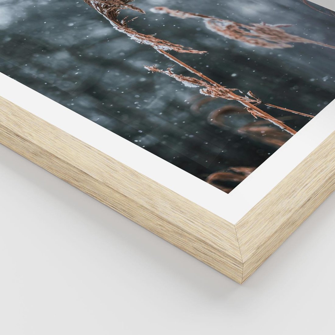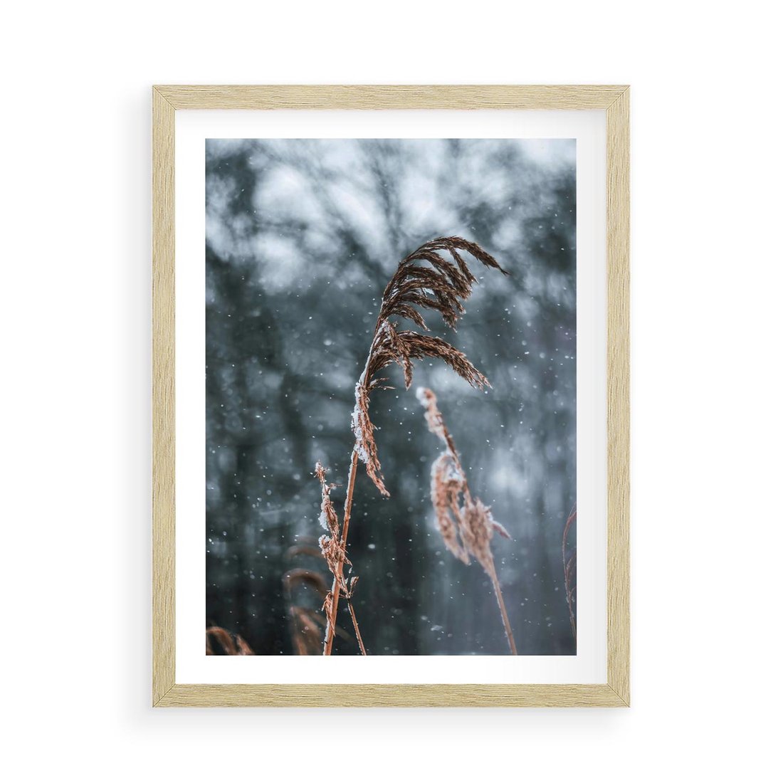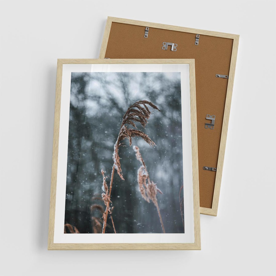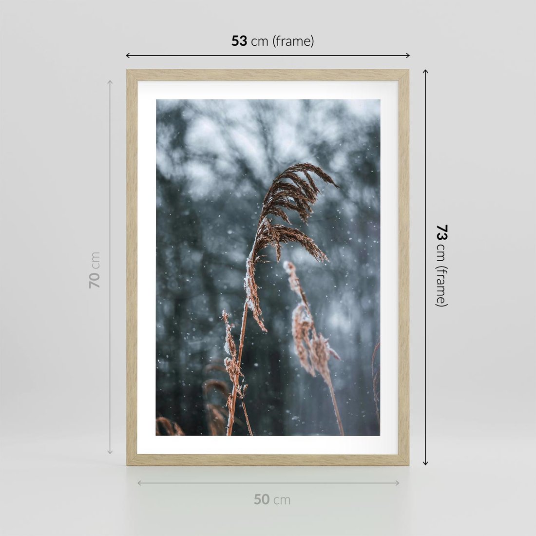 Plakat w ramie 50x70 - Zima na Łonie Natury - sucha wysoka trawa, w zimie - rama drewno
