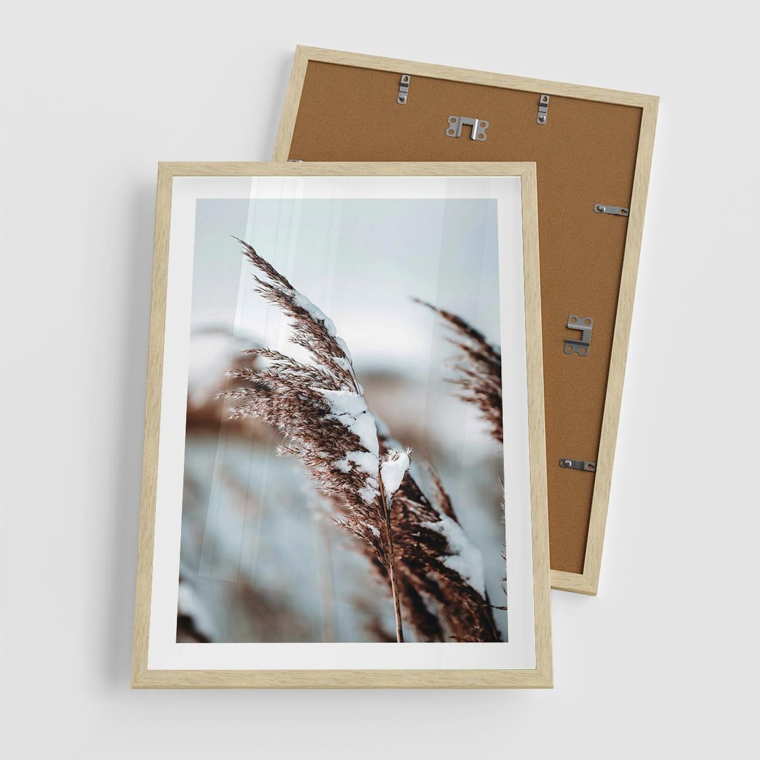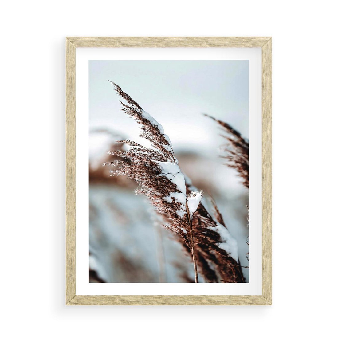 Plakat w ramie 50x70 - Zima na Suchych Trawach - suche trawy, śnieg wysokich na trawach - rama drewno