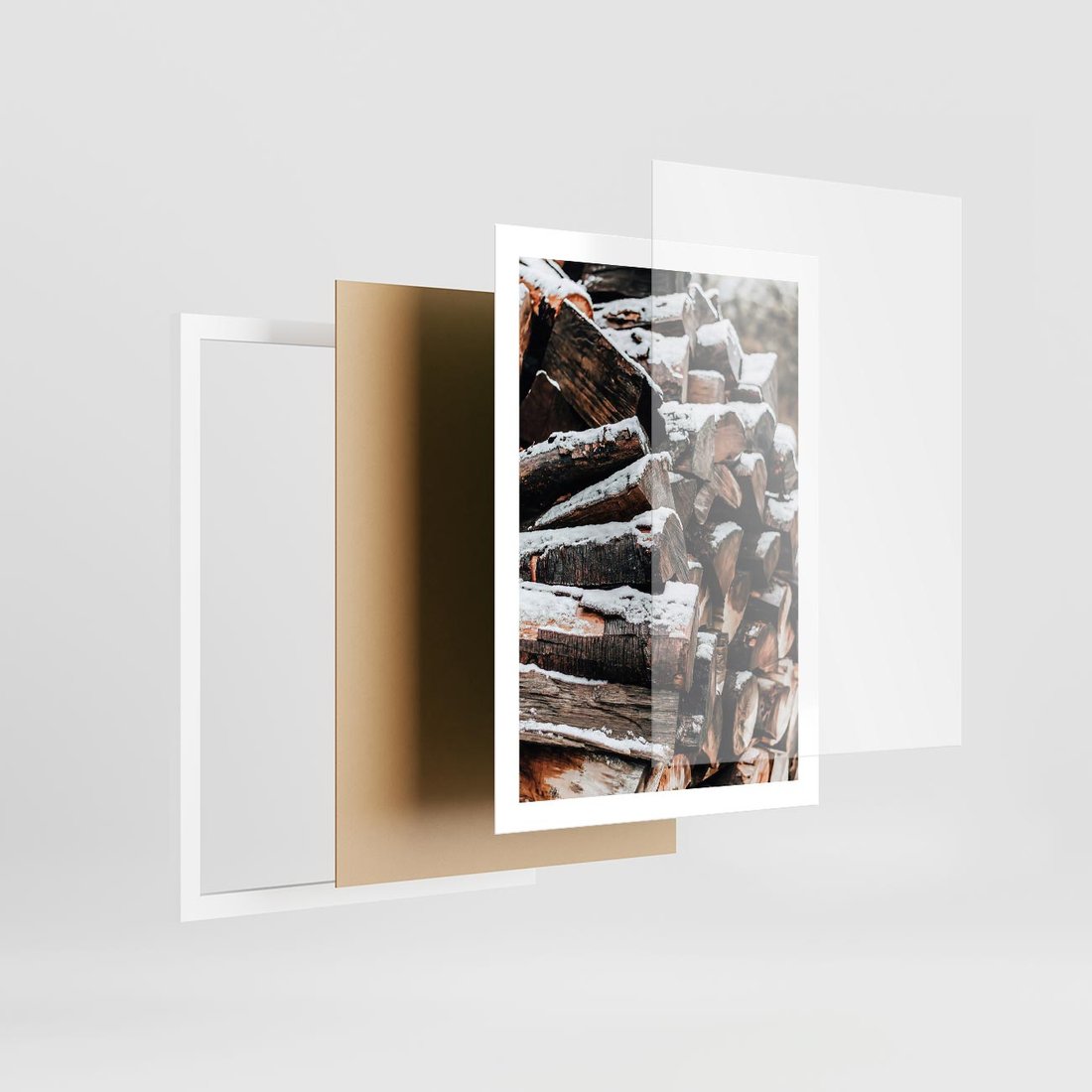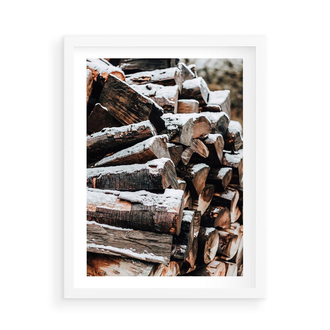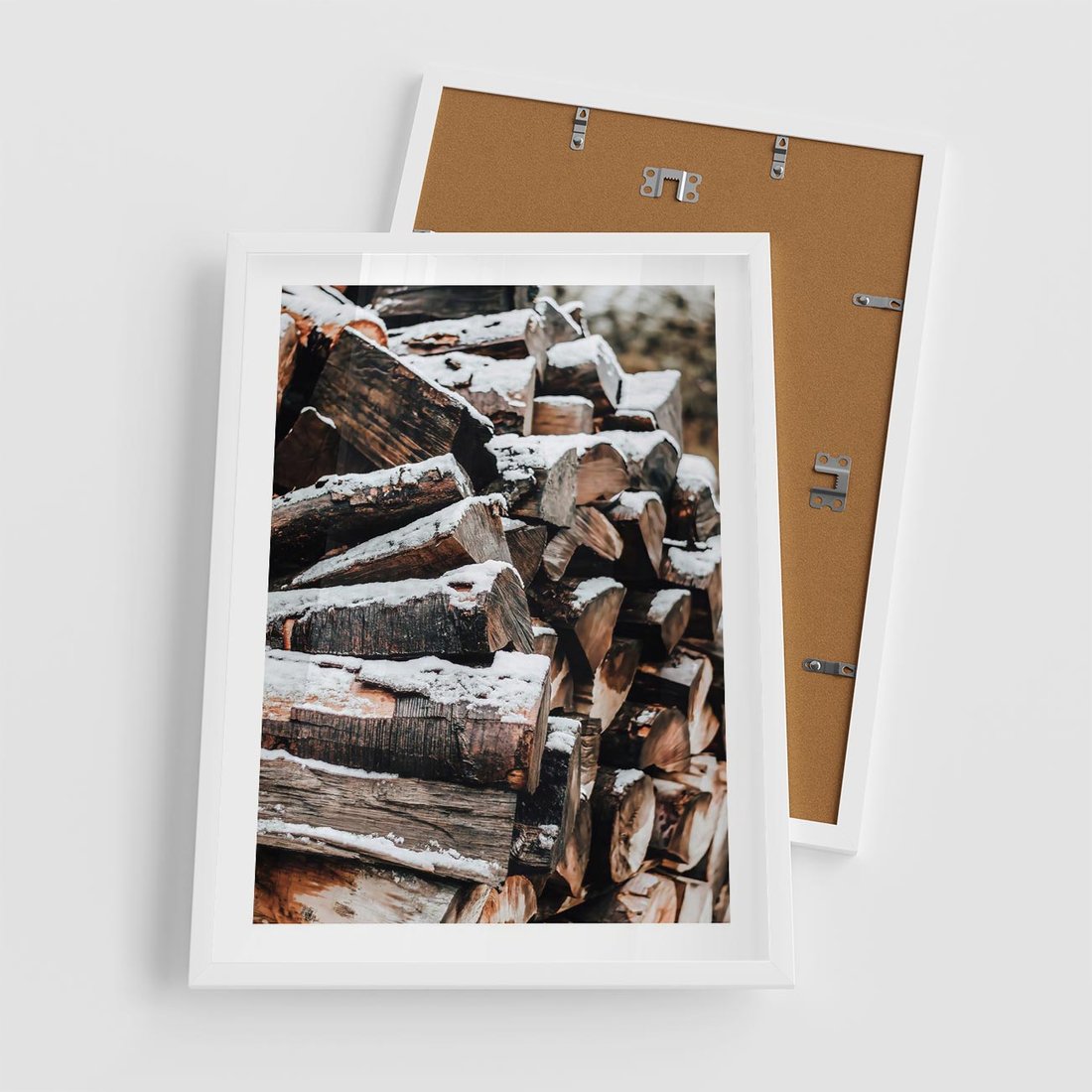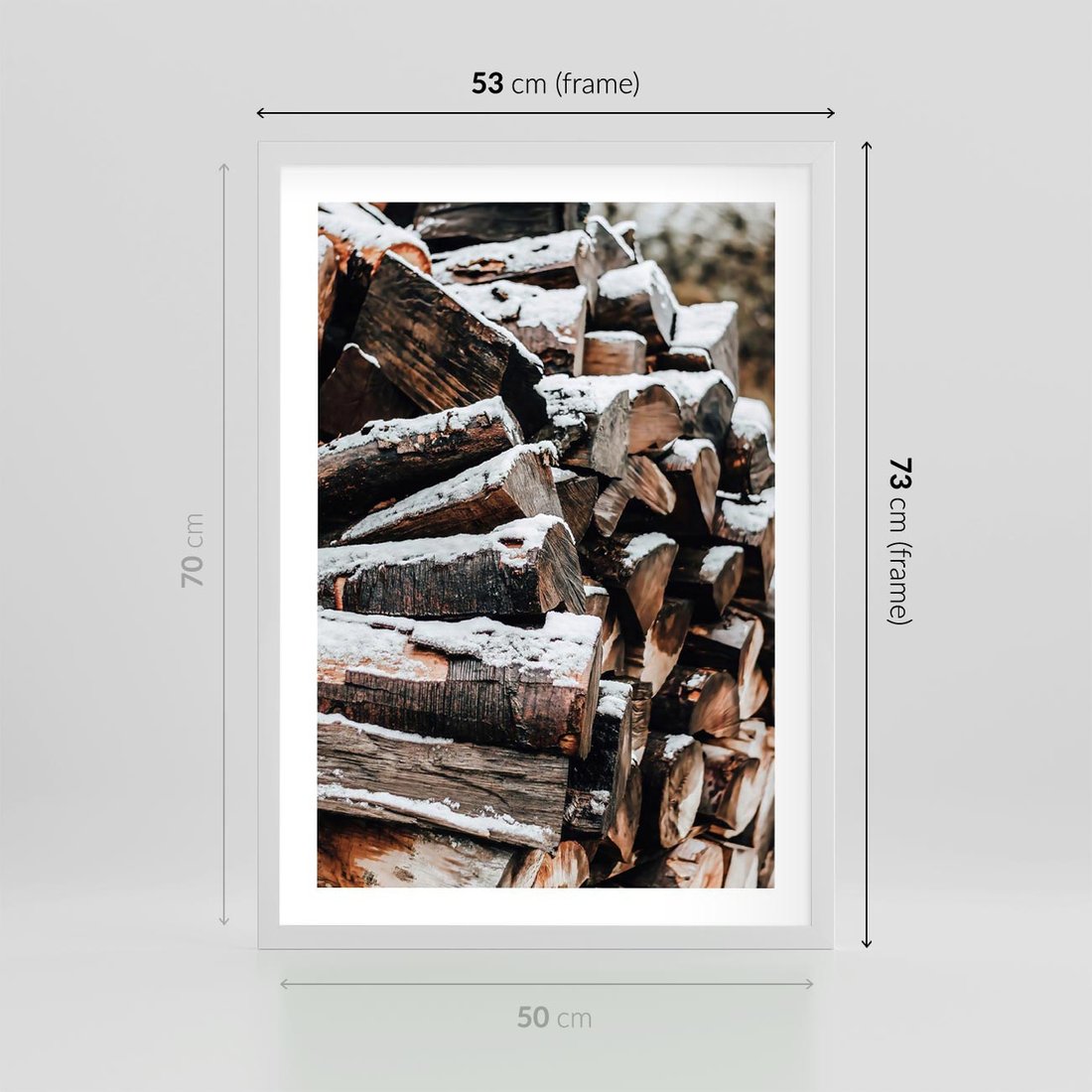 Plakat w ramie 50x70 - Zimowa Drewniana Idylla - drewno, kłody - rama biała