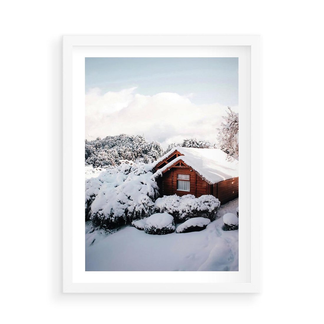 Obraz przedstawia zimowy pejzaż górski z ośnieżonymi szczytami i uroczą chatką w górach. Ta malownicza kompozycja doskonale pasuje do wnętrz, które pragną wprowadzić atmosferę zimowej scenerii i przytulności.